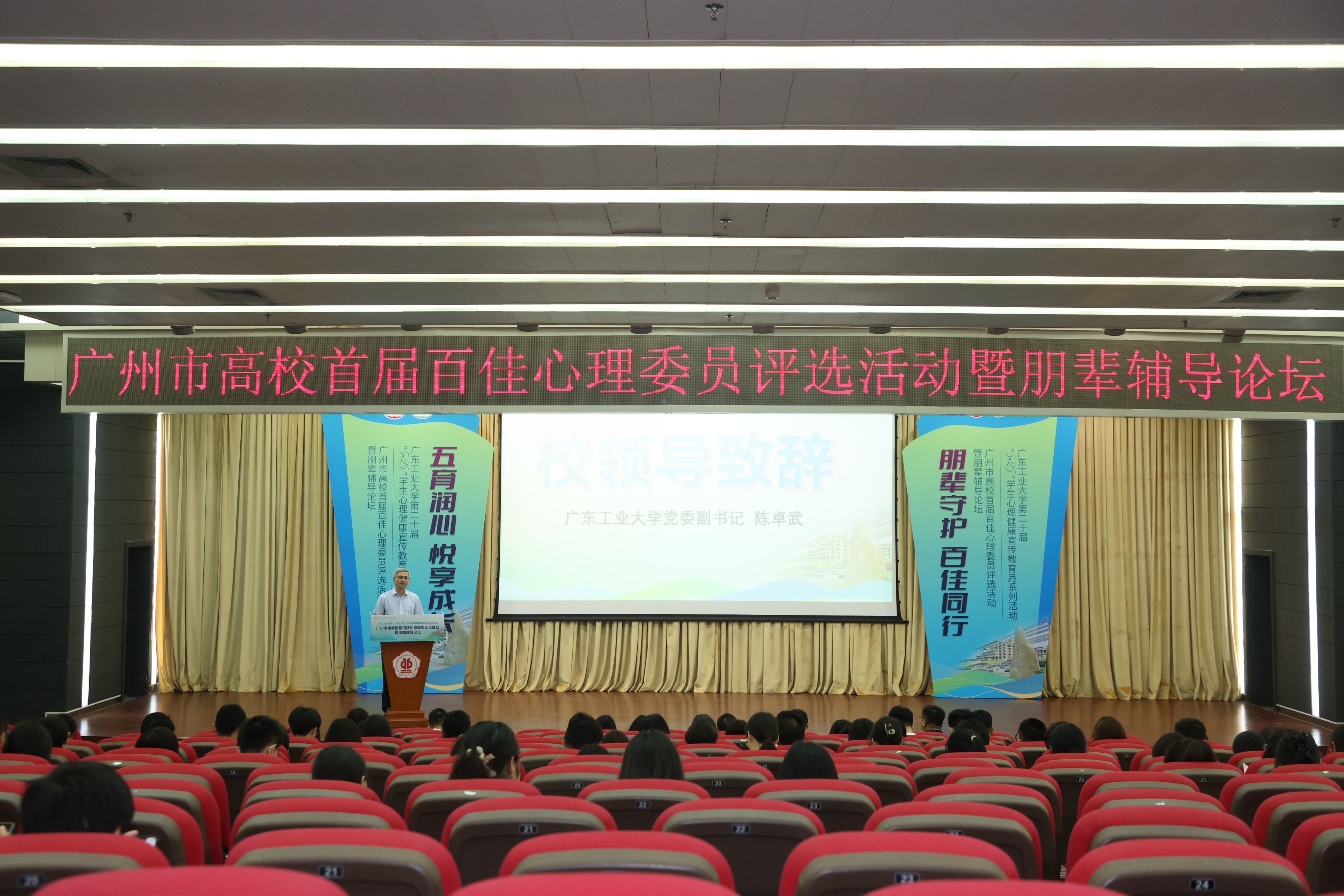 5月23日,广州市高校首届百佳心理委员评选暨朋辈辅导论坛在我校大学城校区大讲堂中心报告厅举行。中国心理学会心理危机干预工作委员会副主任、天津大学心理研究所创始所长詹启生教授,广东省普通高等学校学生心理健康教育专家指导委员会副主任委员李桦教授,广州市心理学会秘书长王孟成教授前来指导。学校党委副书记陈卓武研究员出席并发表讲话。来自广州市43所高校的专家及优秀心理委员代表、我校各二级学院心理指导老师及心理委员近300人参与此次会议。