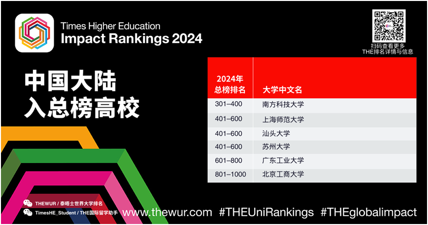 6月12日,泰晤士高等教育发布了2024年泰晤士高等教育世界大学影响力排名(THE Impact Rankings 2024),展示了世界高校在推动联合国可持续发展目标(SDGs)方面所做的努力。今年中国大陆有11所大学上榜,我校是六所进入排名总榜的大学之一,全国排名第5。