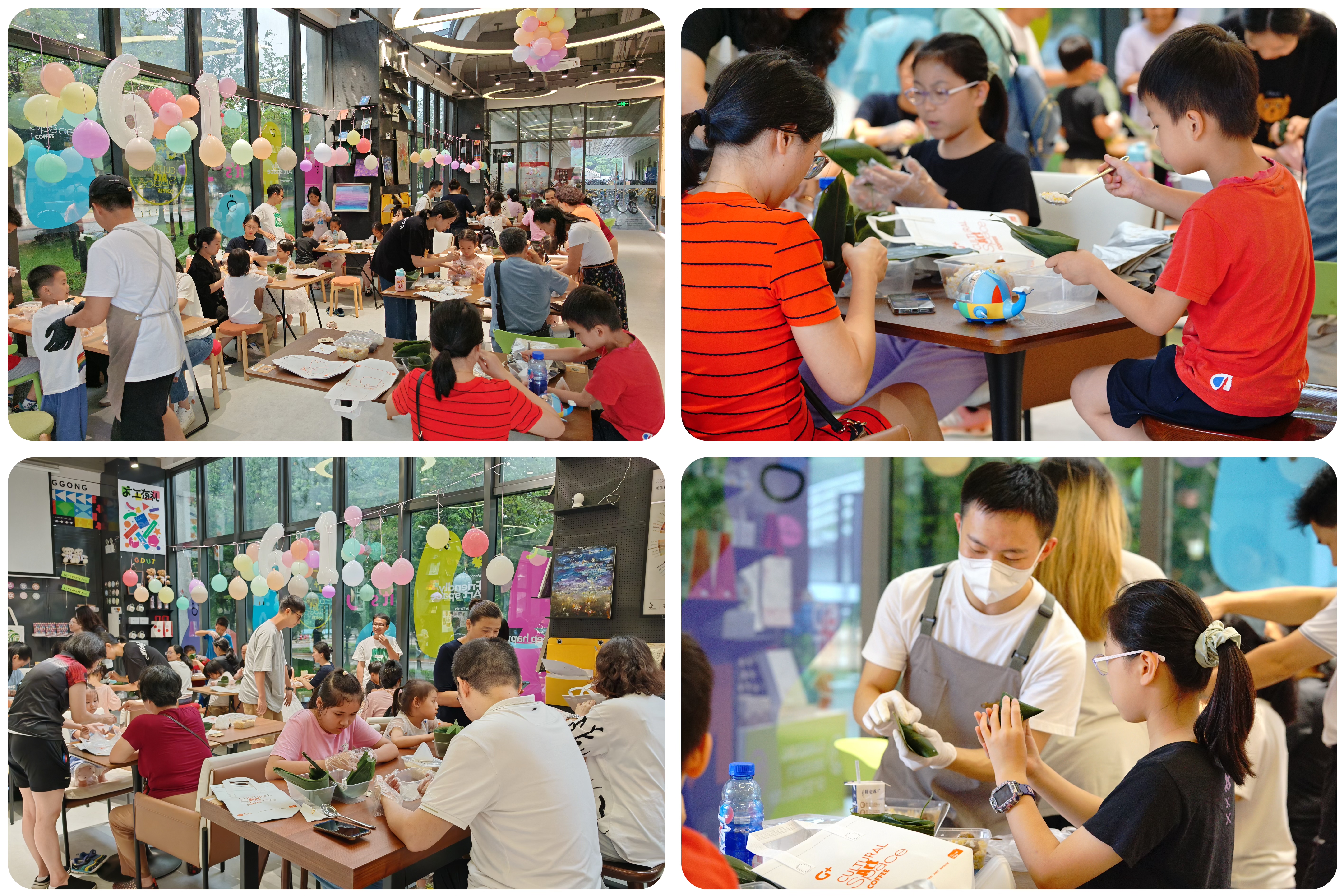 临近端午节,学校在图书馆一楼G+coffee举办了“大手小手包粽子”亲子活动,30对教职工及子女参加了此次活动,共同迎接传统节日端午节。工作人员准备了冰粽和传统粽子两种食材用品,邀请专业师傅现场传授包粽子的手法与技巧。孩子们和家长们一起认真学习,折粽叶、放糯米、加蜜枣、裹扎绳,包好传统的粽子碧绿喜人。做好的冰粽则晶莹剔透,隐隐透出里面莲蓉、豆沙的馅儿,格外诱人。大家品尝着自己亲手包的粽子,现场欢声笑语,其乐融融。