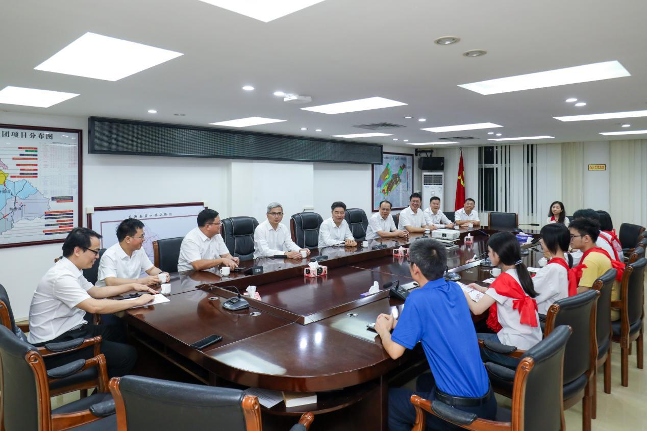 在蓝口镇政府会议室内,胡钦太和邱学青与同学们亲切交流,气氛轻松愉悦。