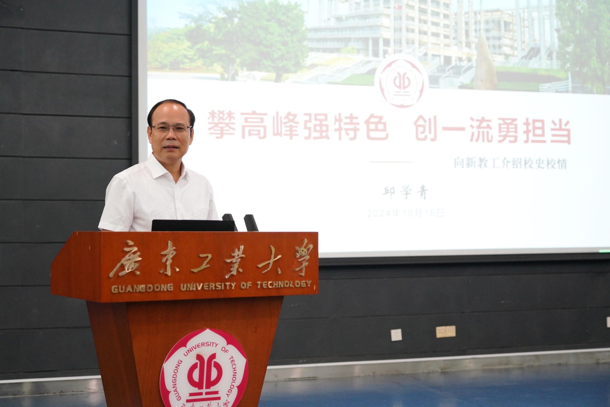 邱学青带领新教工一起回顾了广工立校的“红色基因”和自强不息、奋发图强的办学历程,向新教工们展示了建校60多年来“扩规模”“拓空间”“上水平”“攀高峰”的办学成就,他指出,广工以“大、实、特、快”的发展特点,将举全校之力,抢抓机遇,深入实施“1+2+3”攀撑计划,全力打造“支撑粤港澳大湾区发展,工科特色鲜明,极具创造活力,世界知名”的高水平创新型大学。他寄语新教工们:立德树人,做学生品格锤炼的引路人;教学相长,做学生智慧启迪的领航员;潜心科研,做国家科技创新的主力军;勇于担当,做学校发展建设的推动者。他衷心希望新教工们要提升本领、勇挑重担、主动奉献、敢为人先,与学校一道跑出加速度、拼出高质量!