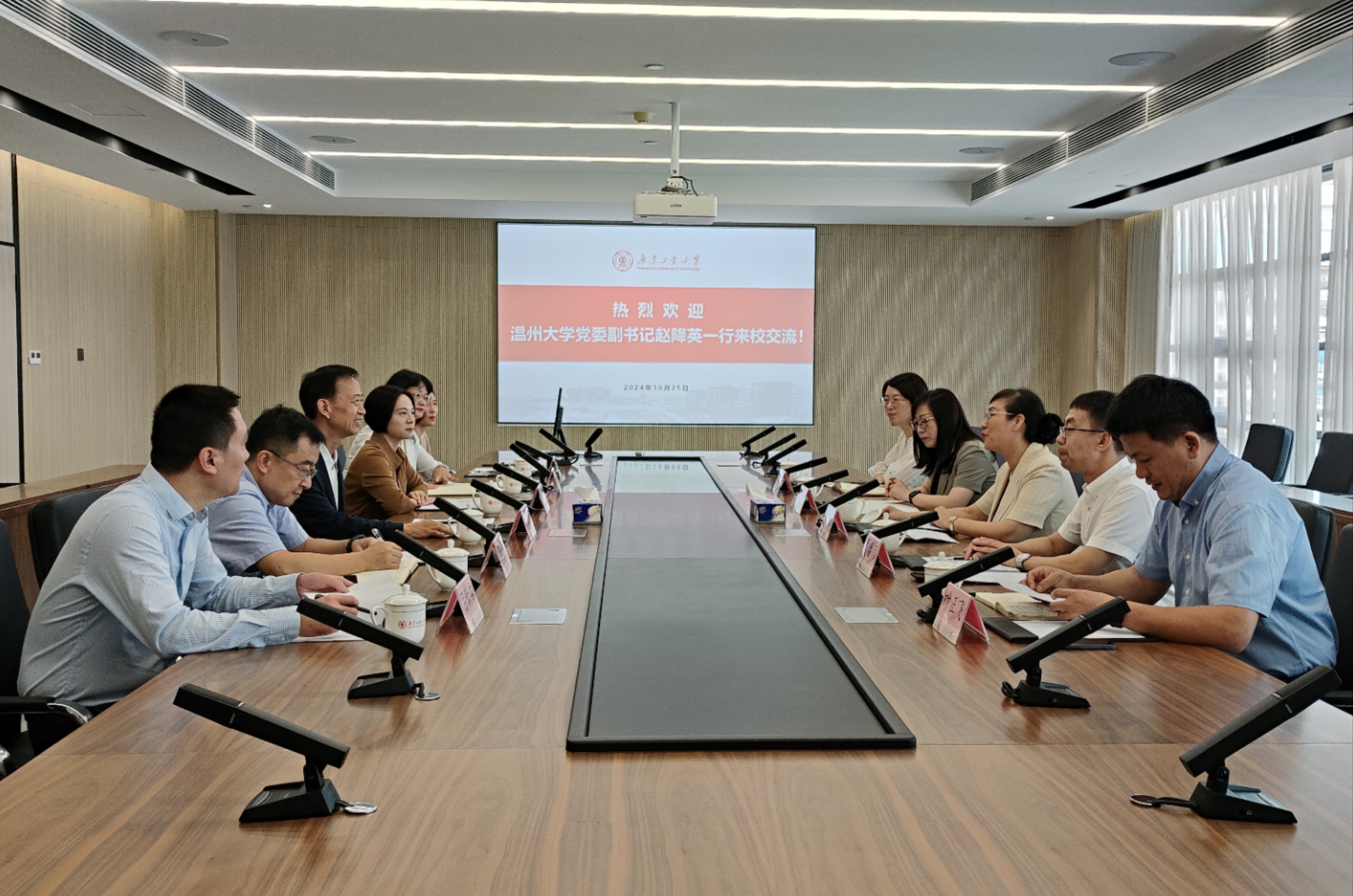 赵降英介绍了温州大学的基本情况,对广工近年来的快速发展以及党建工作所取得的成绩表示高度赞赏,认为广工的经验做法值得学习和借鉴,希望两校以此为契机,深化交流、共同学习,携手开创工作新局。