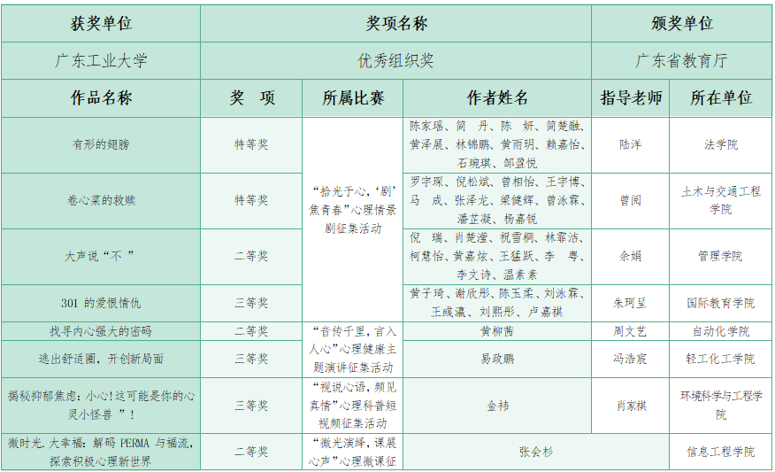 近日,广东省教育厅公布了2024年“5·25”大学生心理健康月系列活动结果,广工报送的作品荣获特等奖2项,二等奖3项,三等奖4项,获奖成绩在全省高校中名列前茅,学校荣获优秀组织奖(全省仅三所),获奖情况如下: