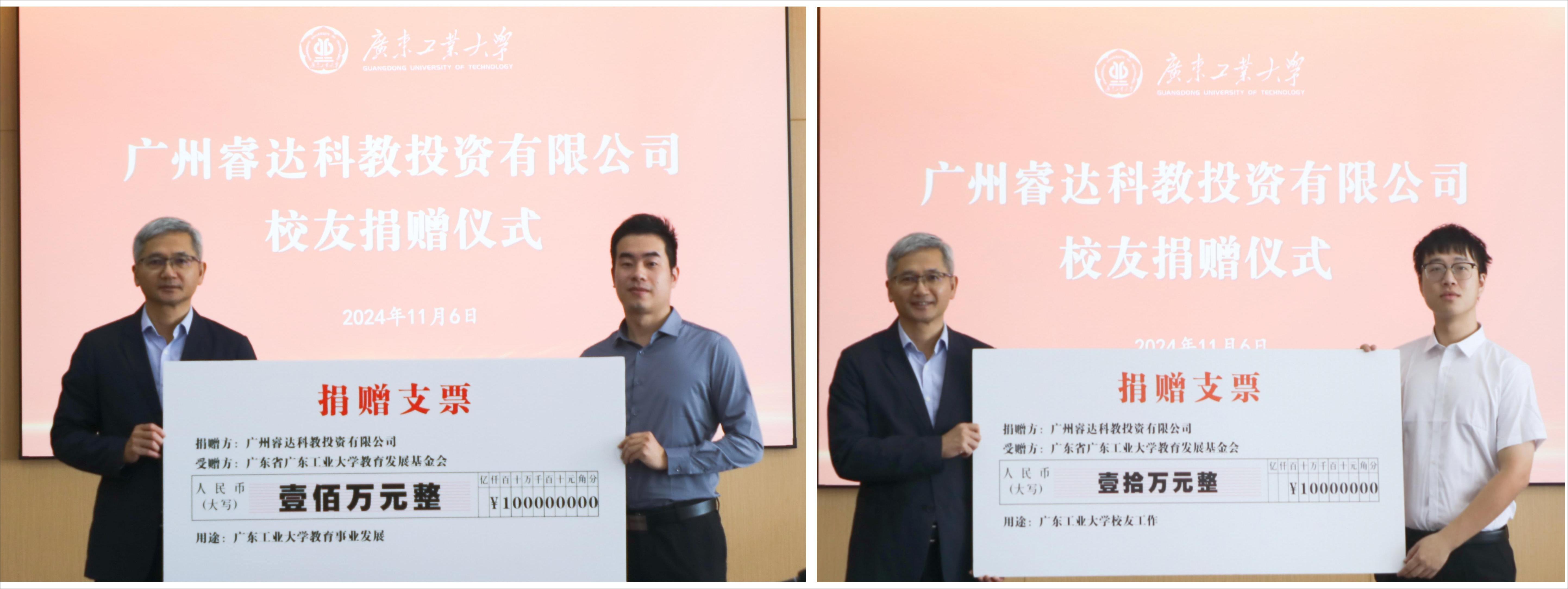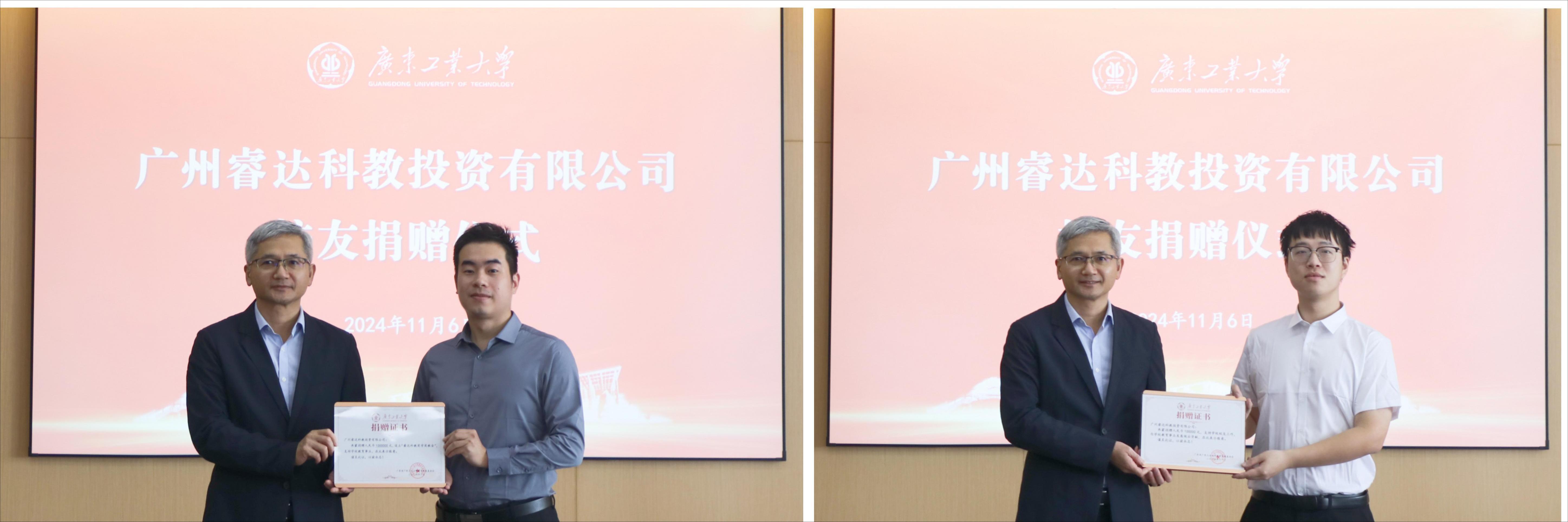 会上,陈卓武代表学校接受广州睿达科教投资有限公司共计110万元的捐赠,其中100万元将用作学校师生奖教奖学金,10万元将用于支持学校“校友之家”建设。陈卓武向黎耀煜、陈健浩颁发捐赠证书及纪念品。