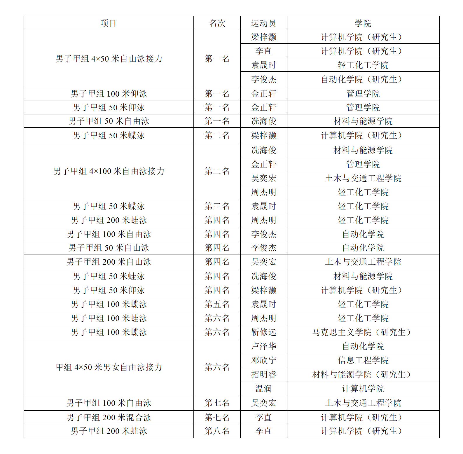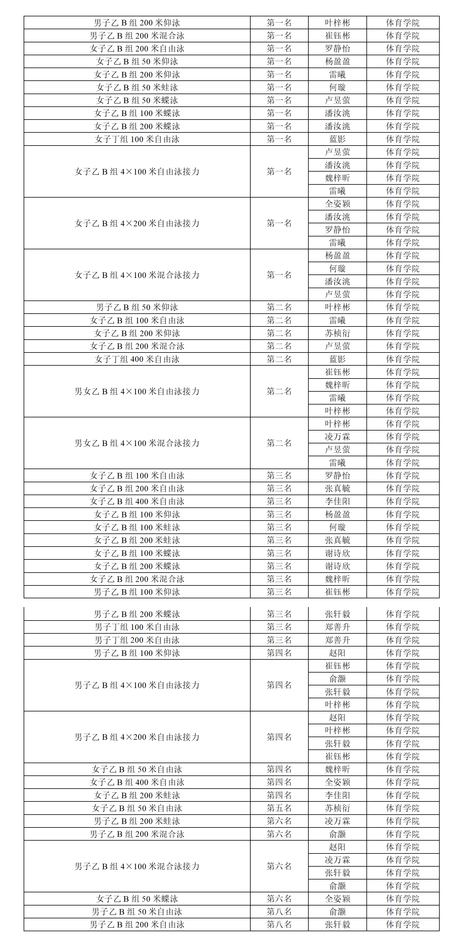 在为期两天的比赛中,广工游泳队展现了极高的竞技水平和顽强的拼搏精神,不畏强手,团结协作,斩获17枚金牌、9枚银牌及14枚铜牌,并荣获乙B组团体总分第一名、甲组团体总分第三名的优异成绩。此外,四位教练员均被授予“优秀教练员”的荣誉称号。