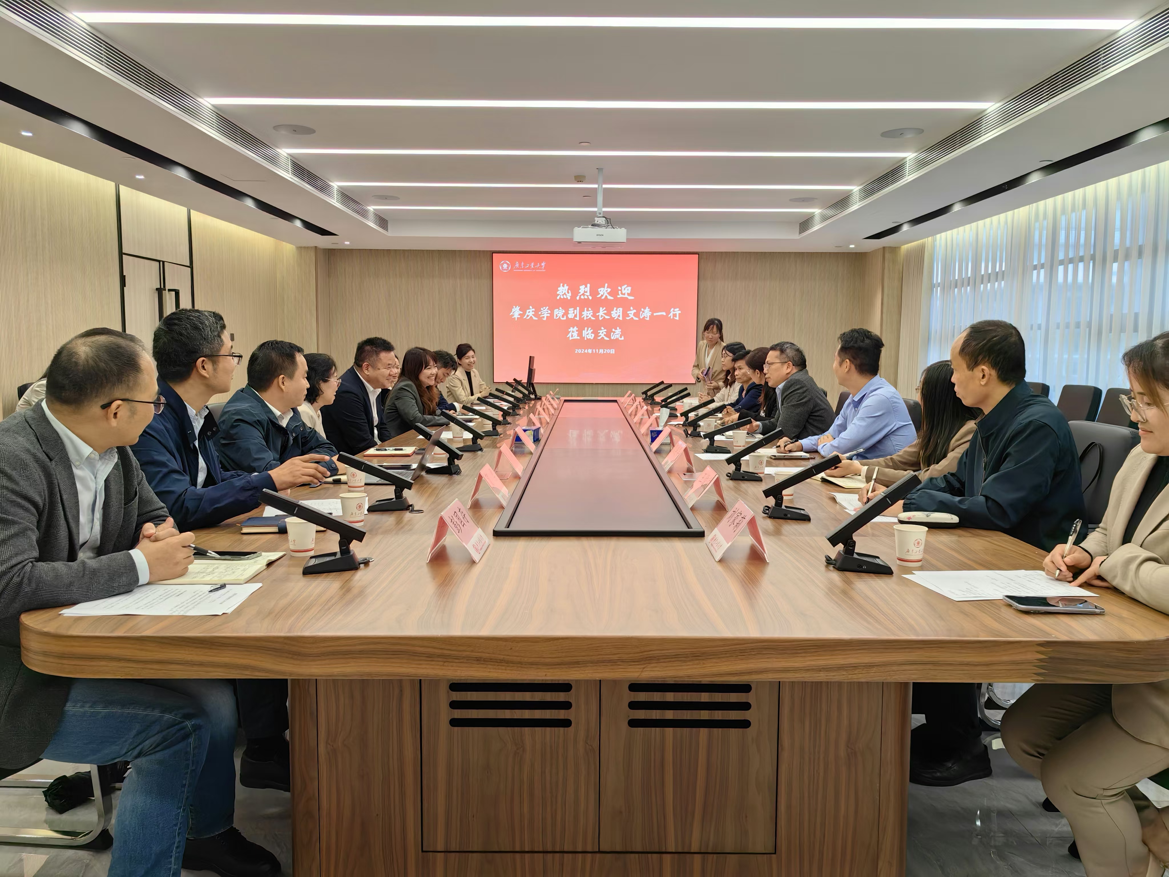 又讯,11月20日,肇庆学院副校长胡文涛一行来我校调研交流。杜承铭出席座谈,教务处、国际合作与交流处、计算机学院、管理学院、经济学院、外国语学院、国际教育学院、国际交流学院等相关人员参加会议。