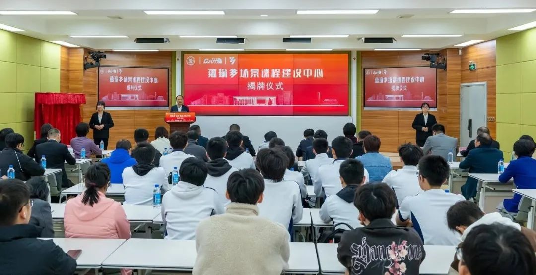 当天,学校还举行了蕴瑜多场景课程建设中心揭牌仪式。作为学校2024年十件民生实事之一,蕴瑜多场景课程建设中心(以下简称“蕴瑜建课中心”)的建成,为人工智能赋能课程教学提供有效支撑,既可以满足老师们多场景录课、多校区直播等教学需求,也可以提升跨校区办校的教学质量。