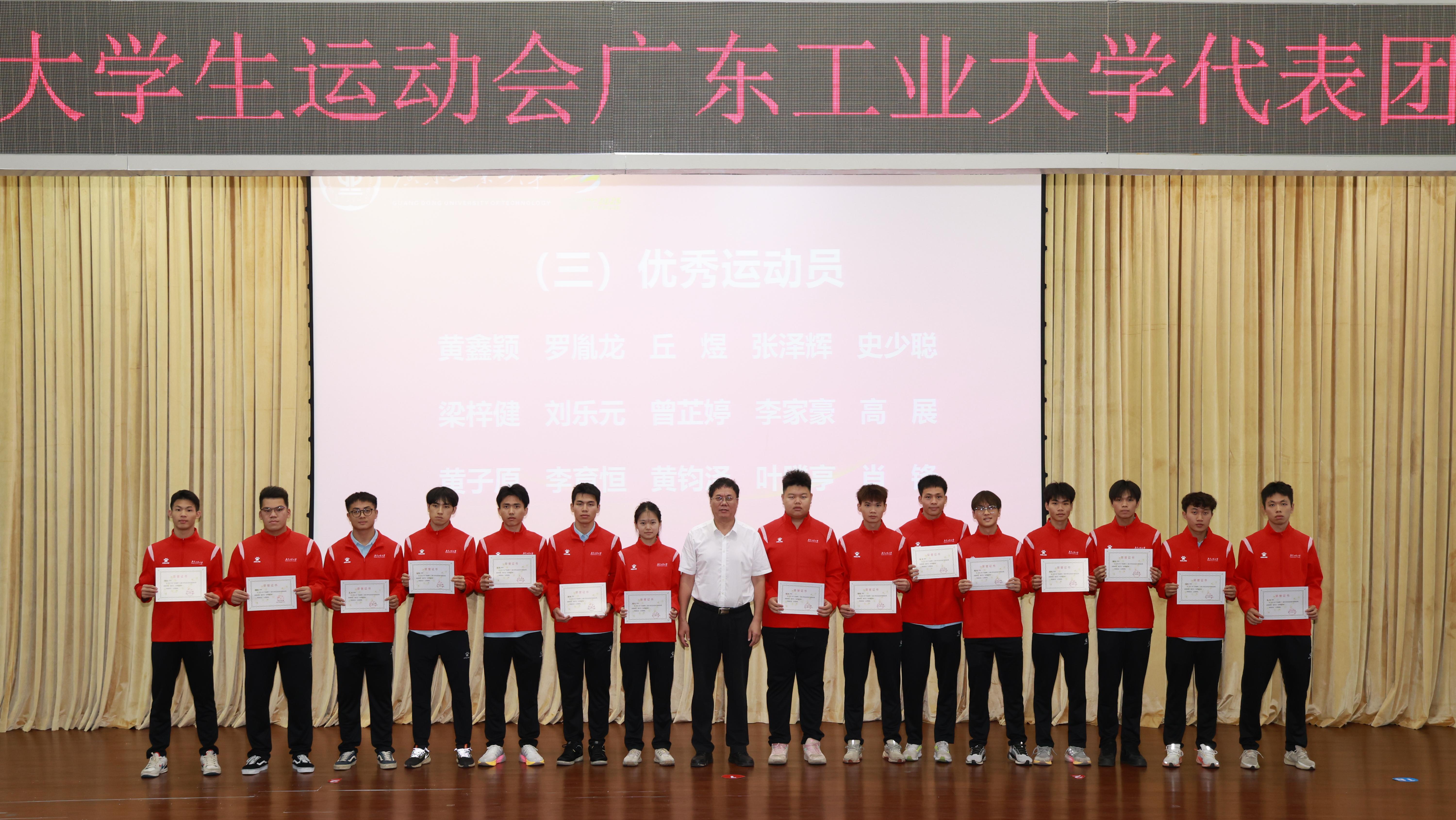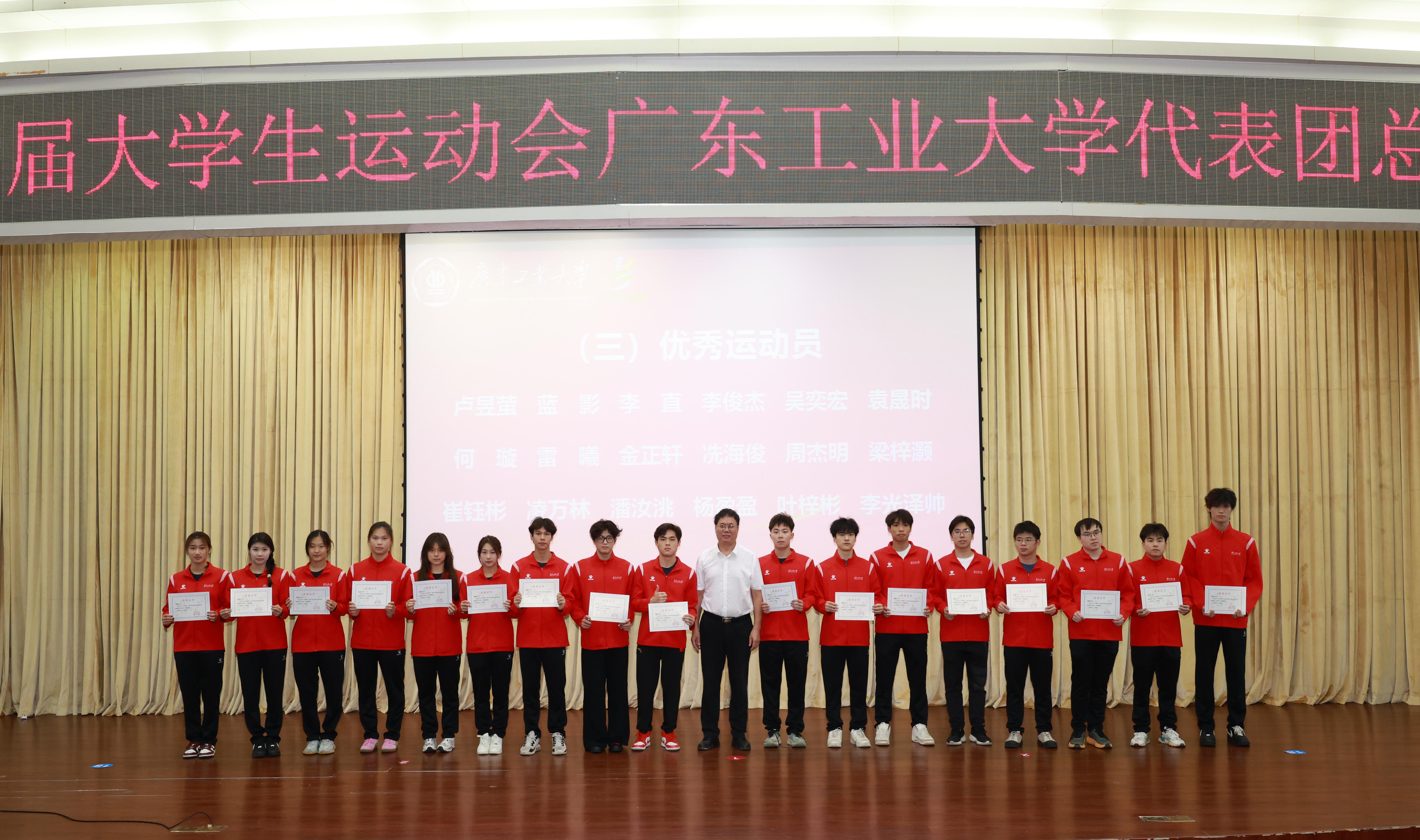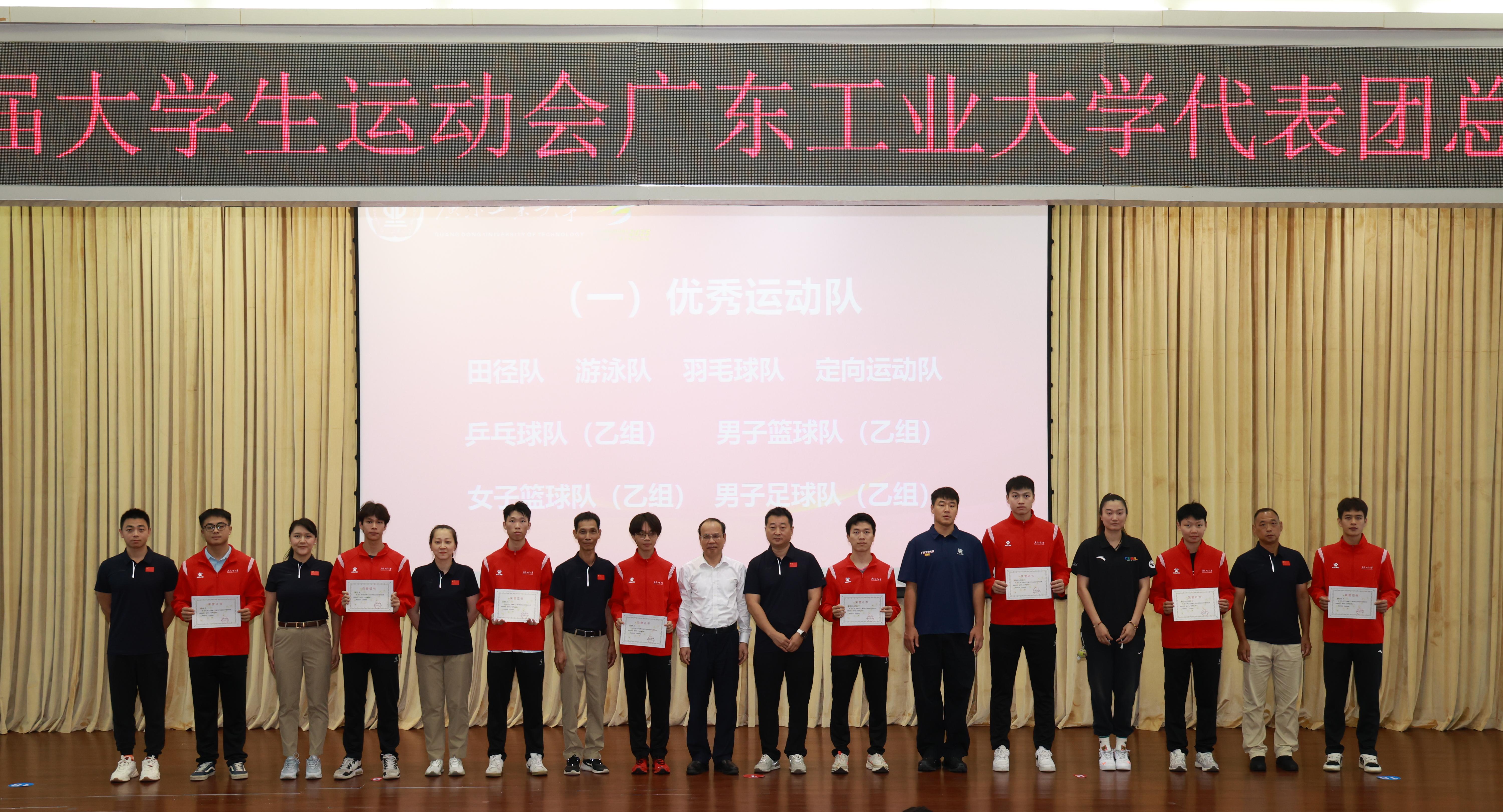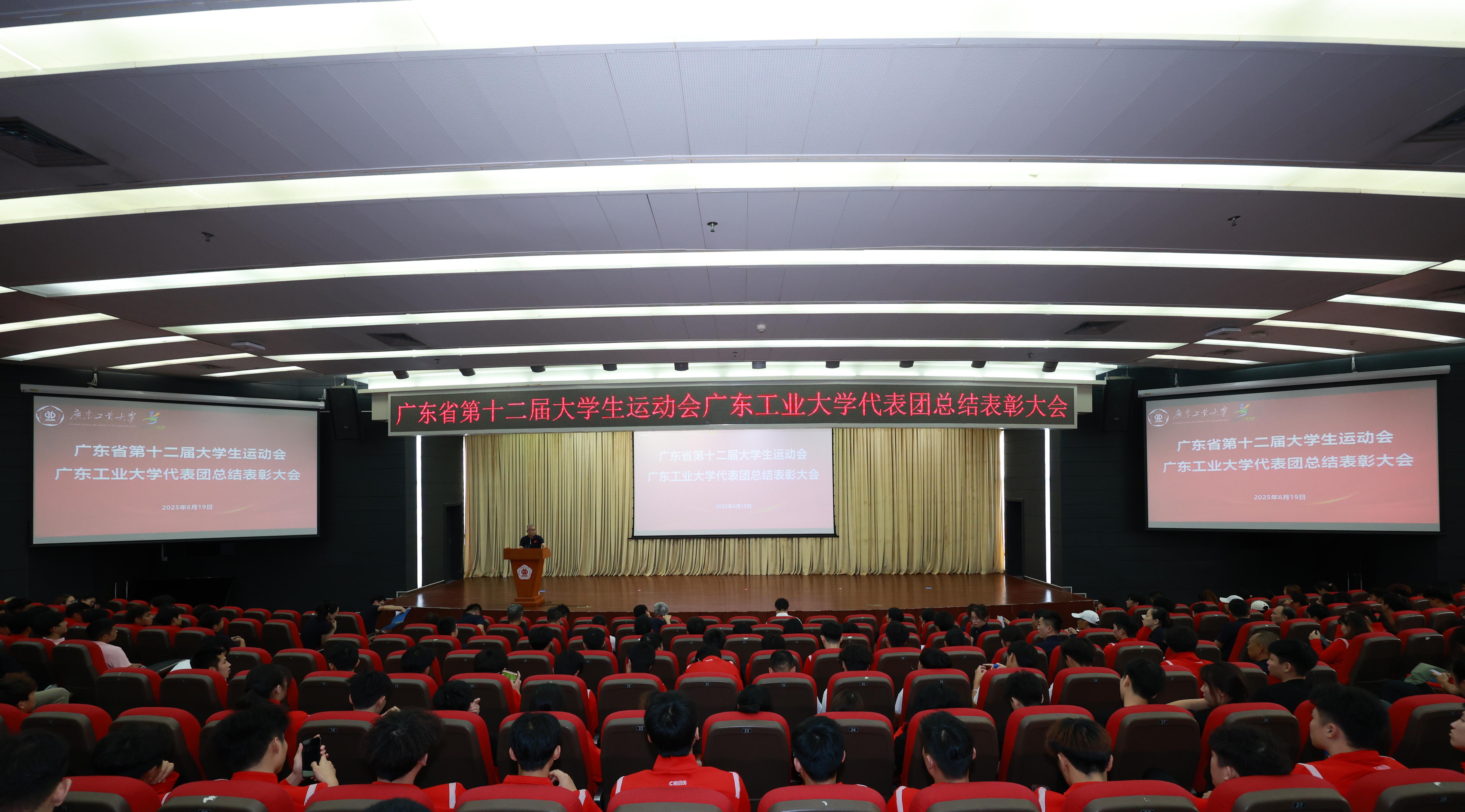 6月19日,学校在大学城校区召开广东省第十二届大学生运动会8xbet网代表团总结表彰大会。广工校长、体育运动委员会主任邱学青,校党委副书记、体育运动委员会副主任、省大运会广工代表团团长陈卓武,党委常委、副校长、体育运动委员会副主任、代表团副团长王振友,党委常委、党委宣传部部长张育广出席,各相关部处和学院的负责人、代表团各运动队领队、教练员和运动员等参加大会。