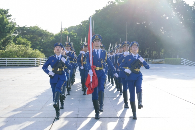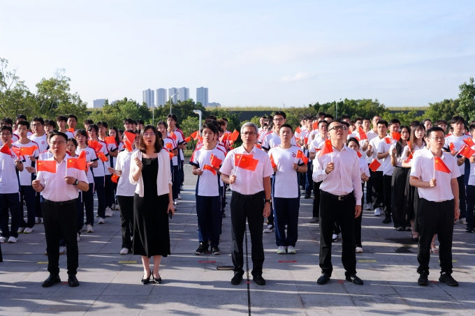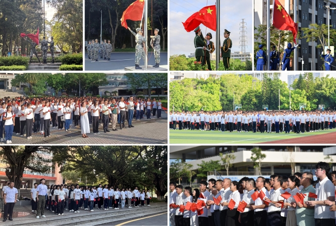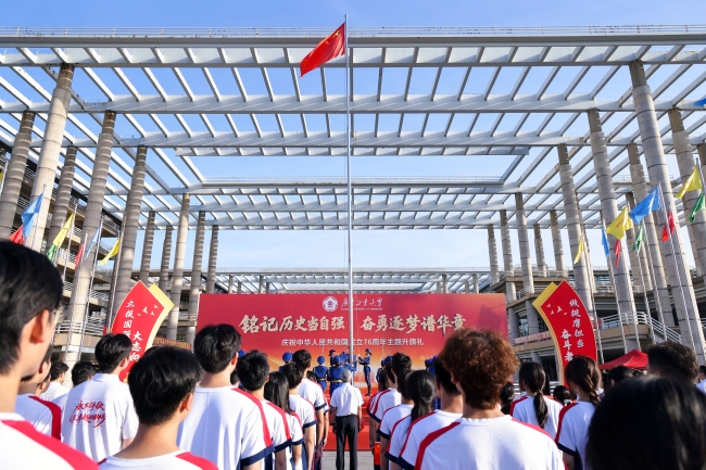 为迎接中华人民共和国成立76周年,弘扬伟大爱国主义精神,引领广大青年学子坚定不移听党话、跟党走,9月29日清晨,学校在各校区同步举行“铭记历史当自强 奋勇逐梦谱华章”主题升旗礼。学校党委副书记陈卓武出席大学城校区主题升旗礼并讲话,党委学生工作部、校团委、心理健康教育中心、各校区各学院相关负责同志,辅导员代表与学生代表参加升旗礼,师生同升国旗、同唱国歌,共同祝福祖国、献礼祖国。