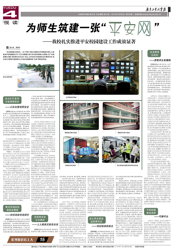 近年来,学校投入850余万元,建设涵盖大学城校园、东风路校区和龙洞校区的视频监控系统。利用大学城管委会60余万元补助款,学校再投入355.5万元,进行全校治安视频升级改造,实现全校重点区域治安视频100%覆盖,形成监控与打击防范合一的防控网络,有效提升了打防控整体效能。