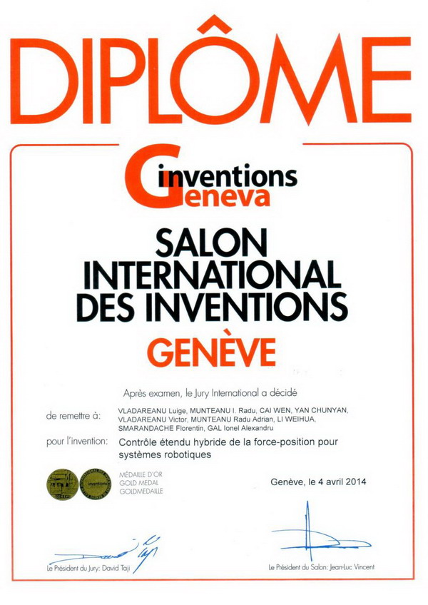 本网讯 2012年,罗马尼亚科学院机器人研究室主任LuigeVladareanu教授来8xbet网可拓学与创新方法研究所学习、研究可拓学,并与可拓学创始人蔡文研究员签订了国际协议,由LuigeVladareanu教授、蔡文研究员、杨春燕研究员、李卫华教授等合作研究可拓学在机器人领域的应用。其后,合作项目“The Extended Hybrid Force-Position Control of the Robotic Systems”申报了罗马尼亚的专利,于2014年参加了日内瓦国际发明博览会,获得金奖,其后又获得罗马尼亚教育部和科技部的金奖。