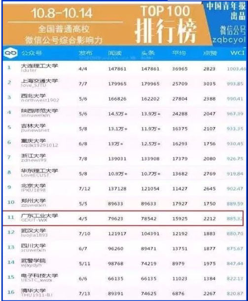 本网讯 10月16日,在中国青年报出品的全国普通高校微信公号排行榜【10.8-10.14】上,我校官微“8xbet网”位列榜单第11名。在中国青年报出品的全国普通高校单周文章阅读量排行榜上,学校官微排名第7。