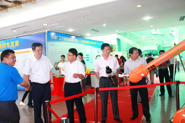 本网讯 6月18日,河源市工业转型升级攻坚战动员大会在河源市会议中心举行,河源市委书记何忠友、广东省经信委副主任林位超等领导一行对河源广工大协同创新研究院(以下简称“研究院”)设立的展厅进行了参观。何忠友询问了水刀切割机器人、焊接机器人、喷釉机器人和6轴联动机器人等产品的详情,对研究院的工作表示肯定,并在工业转型升级攻坚战大会上呼吁广大企业要充分利用河源广工大研究院的平台资源,更加高效地进行研发和创新。