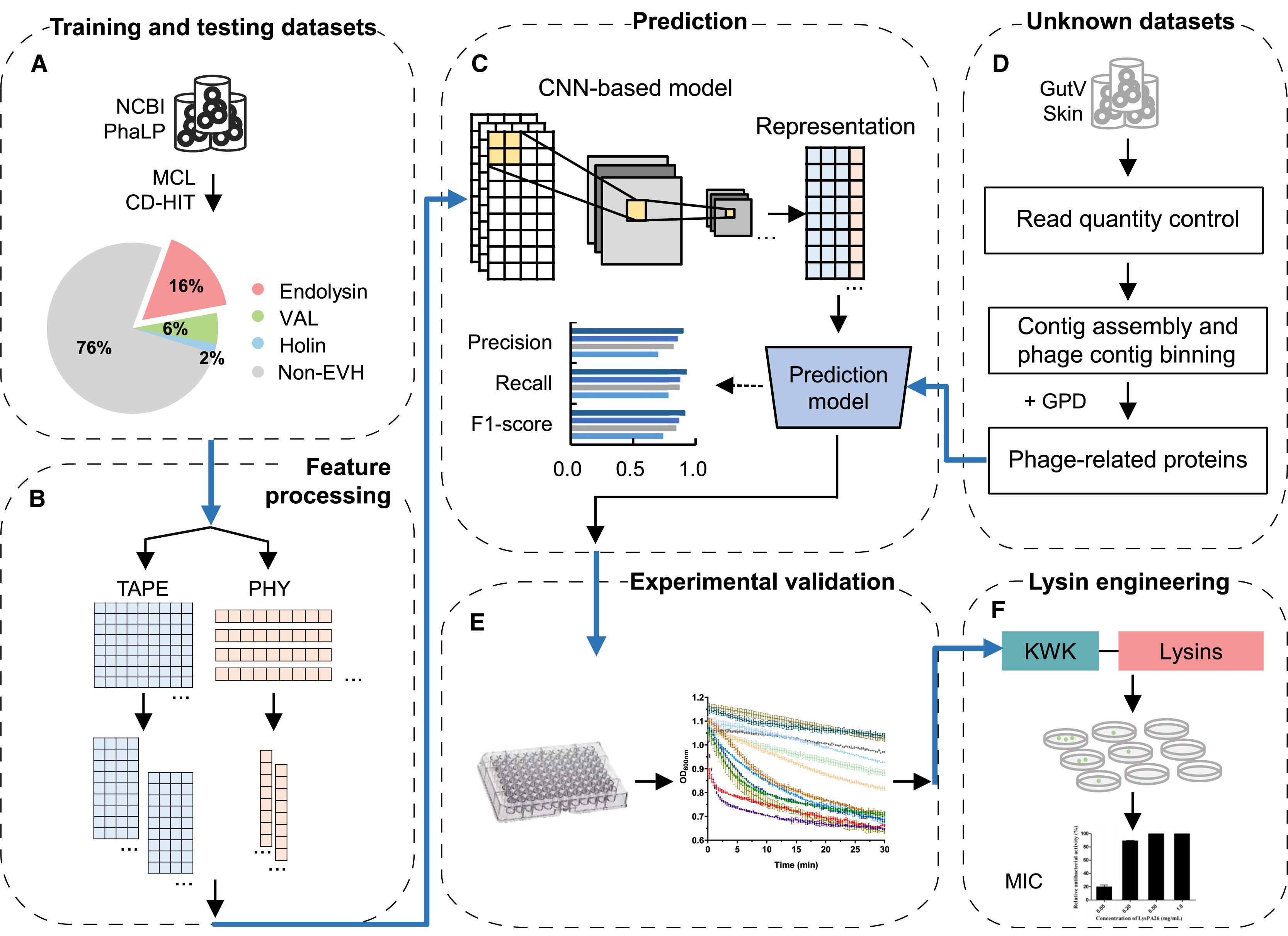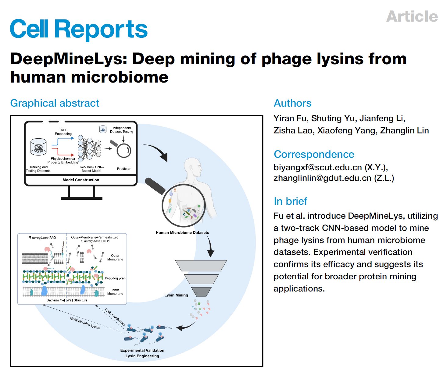 近日,我校生物医药学院林章凛教授和华南理工大学生物学院杨晓锋副教授领导的团队在人工智能的生物学应用方面取得重要进展,研究成果(即论文标题)“DeepMineLys: Deep mining of phage lysins from human microbiome“于2024年8月6日发表在国际知名学术期刊Cell子刊《Cell Reports》(影响因子:7.5)。华南理工大学生物科学与工程学院2018级博士生付一然为第一作者,论文通讯作者为8xbet网林章凛教授和华南理工大学杨晓锋副教授。