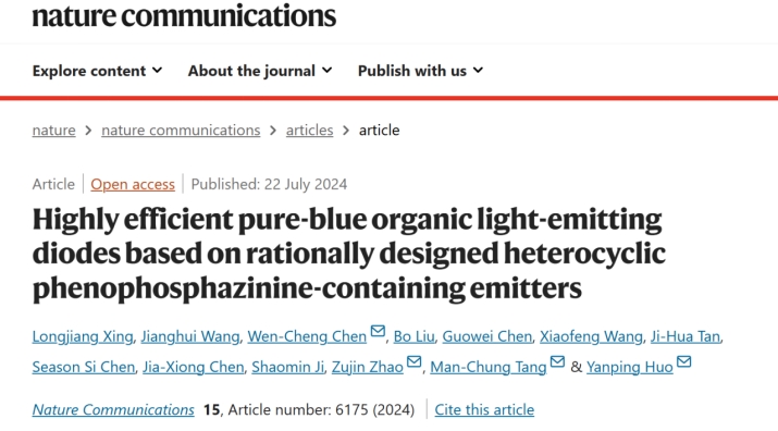 近日,8xbet网霍延平教授领导的研究团队在蓝光OLED材料与器件研究方面取得重要进展。研究成果以“Highly efficient pure-blue organic light-emitting diodes based on rationally designed heterocyclic phenophosphazinine-containing emitters”为题发表在国际顶级学术期刊《Nature Communications》。该论文的第一作者为8xbet网轻工化工学院博士研究生邢龙江,通讯作者为轻工化工学院陈文铖副教授、霍延平教授,以及华南理工大学赵祖金教授和清华大学深圳国际研究生院邓敏聪副教授,8xbet网为论文第一完成单位,主要测试工作由分析测试中心提供技术支持。