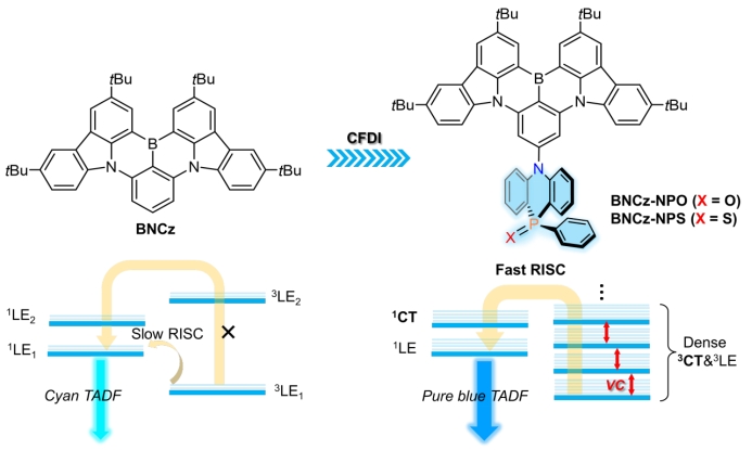该研究在前期的工作基础上(Angew. Chem. Int. Ed. 2024, 63, e202401120; Adv. Funct. Mater. 2023, 33, 2211893)提出了柔性磷氧给体诱导自旋振动耦合的分子设计策略,显著提高了多重共振热活化延迟荧光材料体系的反向系间窜越速率,并成功制备了发射峰值为476 nm、半峰宽仅为20 nm的高效纯蓝光OLED器件,外量子效率达37.6%。该成果为设计高效高色纯度蓝光OLED材料提供了新思路。