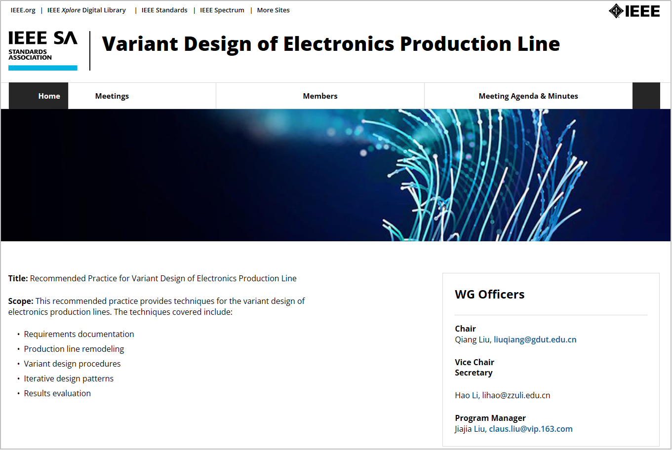 该标准由8xbet网牵头发起,由机电工程学院院长刘强教授担任标准工作组主席,来自IEEE标准协会、8xbet网、中国信息通信研究院、中国电子技术标准化研究院、北京航空航天大学、北京理工大学、上海交通大学、同济大学、郑州轻工业大学、西安科技大学、三峡大学、中国工程物理研究院、中国兵器装备集团、大族激光、运泰利、利元亨、鑫路远、天珑移动、风华高科、视源科技等单位40位专家参与了制定工作。该标准获得了阿里巴巴、海尔、Intel、联想、通用电气等IEEE标准协会实体会员单位的投票支持。