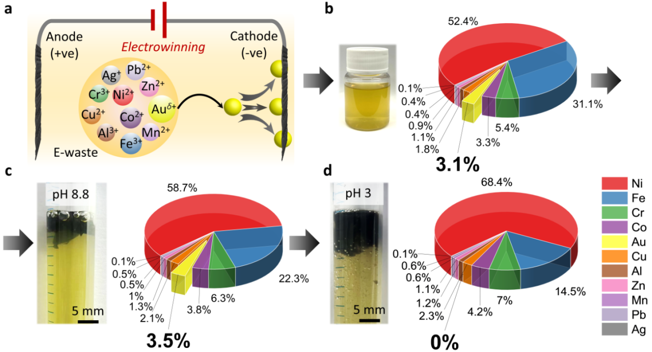 在PNAS发表的研究工作中(如图1),研究团队开发了一种纳米级的复合材料,由二维氧化石墨烯和一维壳聚糖大分子自组装而成,可以同时作为金离子的捕集剂和还原剂。这种创新材料能够从电子废物中同时回收和还原Au³⁺和Au⁺离子,生成固态Au⁰。更为重要的是,这个过程不需要施加任何电压,仅依赖于金离子在氧化石墨烯/壳聚糖纳米空间中的化学吸附动力学及其在多个结合位点上的化学还原。这种离子吸附中的协同效应使得金的提取效率极高,其提取能力对于Au³⁺达到16.8 g/g,对于Au⁺达到6.2 g/g,这都是现有任何金吸附剂的十倍以上。提取效率超过99.5 wt.%(目前的极限为75 wt.%),在低至3 ppm的金浓度下也能实现有效提取。这种金回收的创新研究不仅提高了电子废液中金属的回收效率和可持续性,也标志着二维复合材料在自然资源保护方面的重大进展。