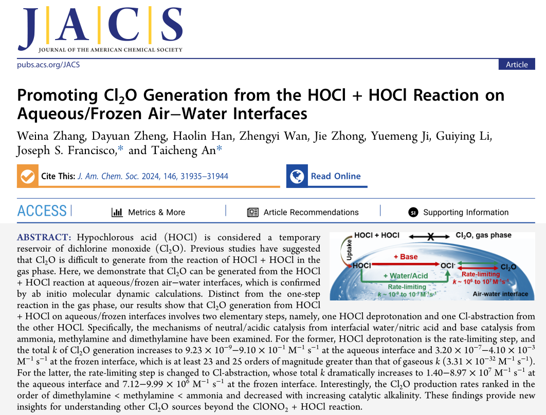 近日,我校环境健康与污染控制研究院、环境科学与工程学院安太成教授团队与美国宾夕法尼亚大学Joseph S. Francisco教授团队合作,在大气中一氧化二氯(Cl2O)形成机理方面取得重要进展。研究成果以“Promoting Cl2O Generation from the HOCl + HOCl Reaction on Aqueous/Frozen Air‒Water Interfaces”(https://pubs.acs.org/doi/10.1021/jacs.4c11337)为题,发表在Journal of the American Chemical Society (2024,146(46): 31935-31944)期刊上。论文的第一作者为张维娜副教授,通讯作者为安太成教授和Joseph S. Francisco教授,8xbet网为论文的第一单位。
