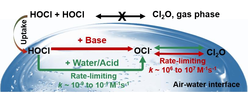 极地平流层中氯自由基加速臭氧层破坏,与臭氧层空洞形成密不可分。另外,对流层中氯自由基具有极强的氧化性,能够快速氧化对流层中碳氢类有机污染物,从而影响大气中羟基自由基、过氧自由基和烷氧自由基的浓度,最终对对流层的大气氧化性、冬季二次污染物生成和人类生态系统的健康保护均具有非常重要影响。大气Cl2O是氯自由基的重要来源。因此,中美两国科学家利用从头算分子动力学计算方法,研究了液相/冰冻层空气-水界面上次氯酸(HOCl)自反应生成Cl2O的化学新机制。研究发现,与气相中HOCl一步自反应即可生成Cl2O的机制不同,液相/冰冻层空气-水界面上的Cl2O生成涉及两个基元反应:i)一个是HOCl脱质子化反应,产生ClO-,ii)另一个是HOCl被ClO-提取Cl-的反应,生成Cl2O。此外还发现在引入水、硝酸,碱如氨、甲胺和二甲胺等作为催化剂后,HOCl的第一步反应脱质子化步骤被明显加快,因此导致Cl2O的生成速率也得到显著提高。特别是在碱催化条件下,Cl2O的生成效率较其他条件具有大幅提升。由此研究表明:在极地平流层和低层对流层大气中,HOCl在液相/冰冻层空气-水界面上的自反应是大气中Cl2O的一个潜在来源。