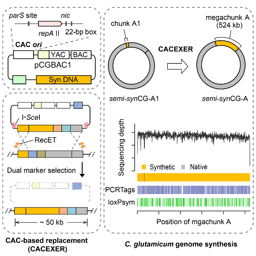 谷氨酸棒杆菌是重要的工业微生物菌株,广泛应用于氨基酸、有机酸及生物基化学品生产。研究团队在前期工作基础上,经过近4年的努力,创新性地开发了继酿酒酵母YAC和大肠杆菌BAC之后的第三个微生物人工染色体载体CAC,可满足50 kb以上大DNA片段在酿酒酵母中组装、在大肠杆菌中扩增、在谷氨酸棒杆菌中复制的需求;通过整合核酸内切酶I-SceI和RecE/RecT重组酶系统,进一步建立了谷氨酸棒杆菌大片段DNA高效替换方法CACEXER。利用该策略,研究团队成功将361 kb合成型DNA整合到谷氨酸棒杆菌的基因组上,并累计替换野生型基因组的16%(524 kb),构建了半合成型菌株semi-synCG-A。