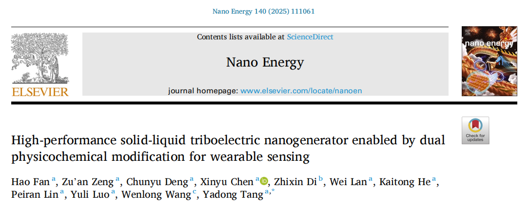 近日,我校生物医药学院汤亚东副教授团队在材料科学和纳米科学领域权威期刊《Nano Energy》(IF=16.8)发表研究论文,题为《High-performance solid-liquid triboelectric nanogenerator enabled by dual physicochemical modification for wearable sensing》。该研究还曾荣获第九届全国大学生生物医学工程创新设计竞赛三等奖。