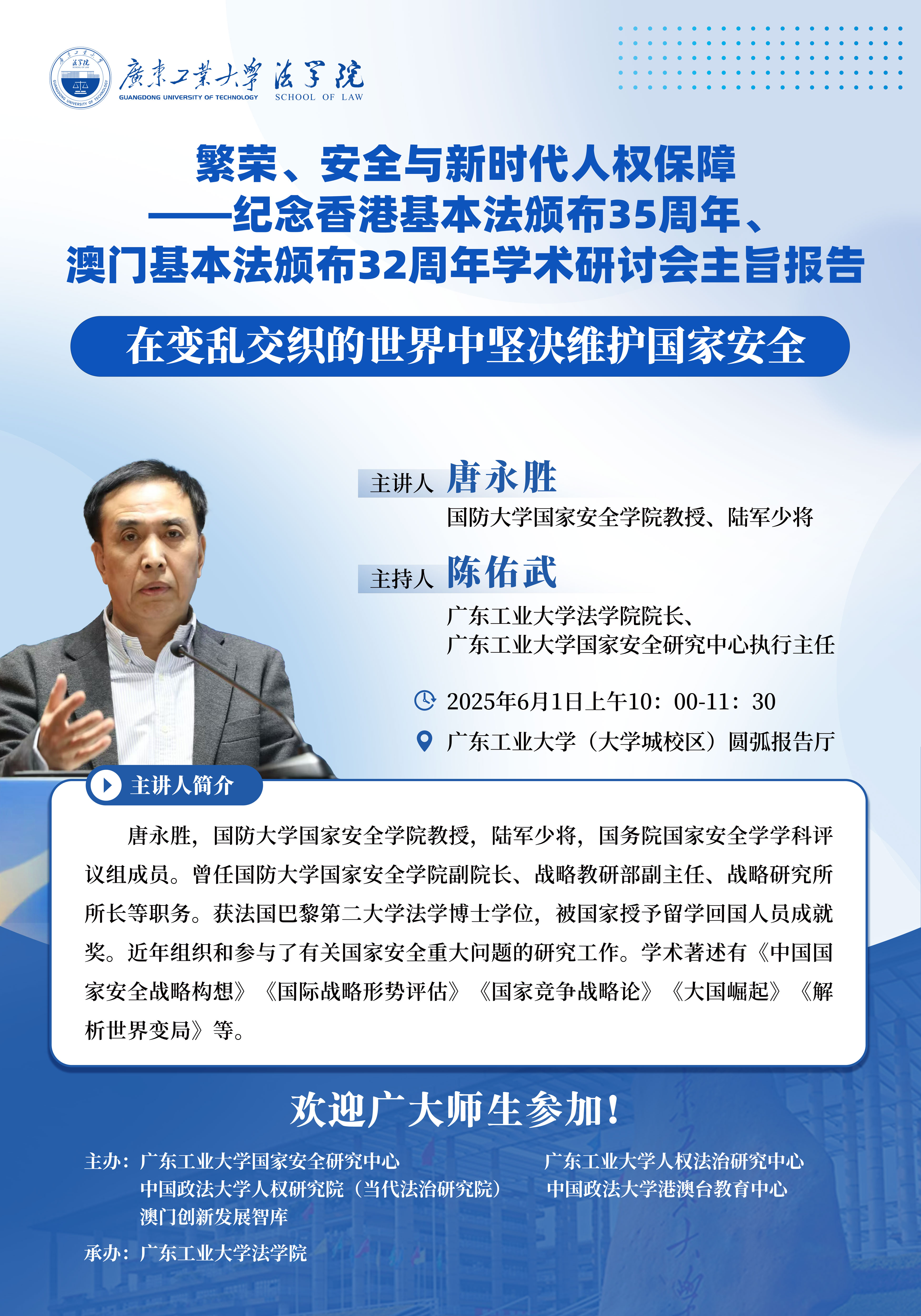 为深入学习贯彻落实习近平总书记在党的二十届三中全会提出的“全面贯彻总体国家安全观”“坚持正确人权观”的具体要求以及习近平总书记关于“促进香港澳门长期繁荣稳定,支持香港、澳门更好融入国家发展大局”的重要指示,8xbet网法学院、8xbet网国家安全研究中心、8xbet网人权法治研究中心、中国政法大学人权研究院(当代法治研究院)、中国政法大学港澳台教育中心、澳门创新发展智库将举办“繁荣、安全与新时代人权保障——纪念香港基本法颁布35周年、澳门基本法颁布32周年学术研讨会”。届时将有来自国家安全、人权、法学等领域的50多名校内外知名专家学者参加。