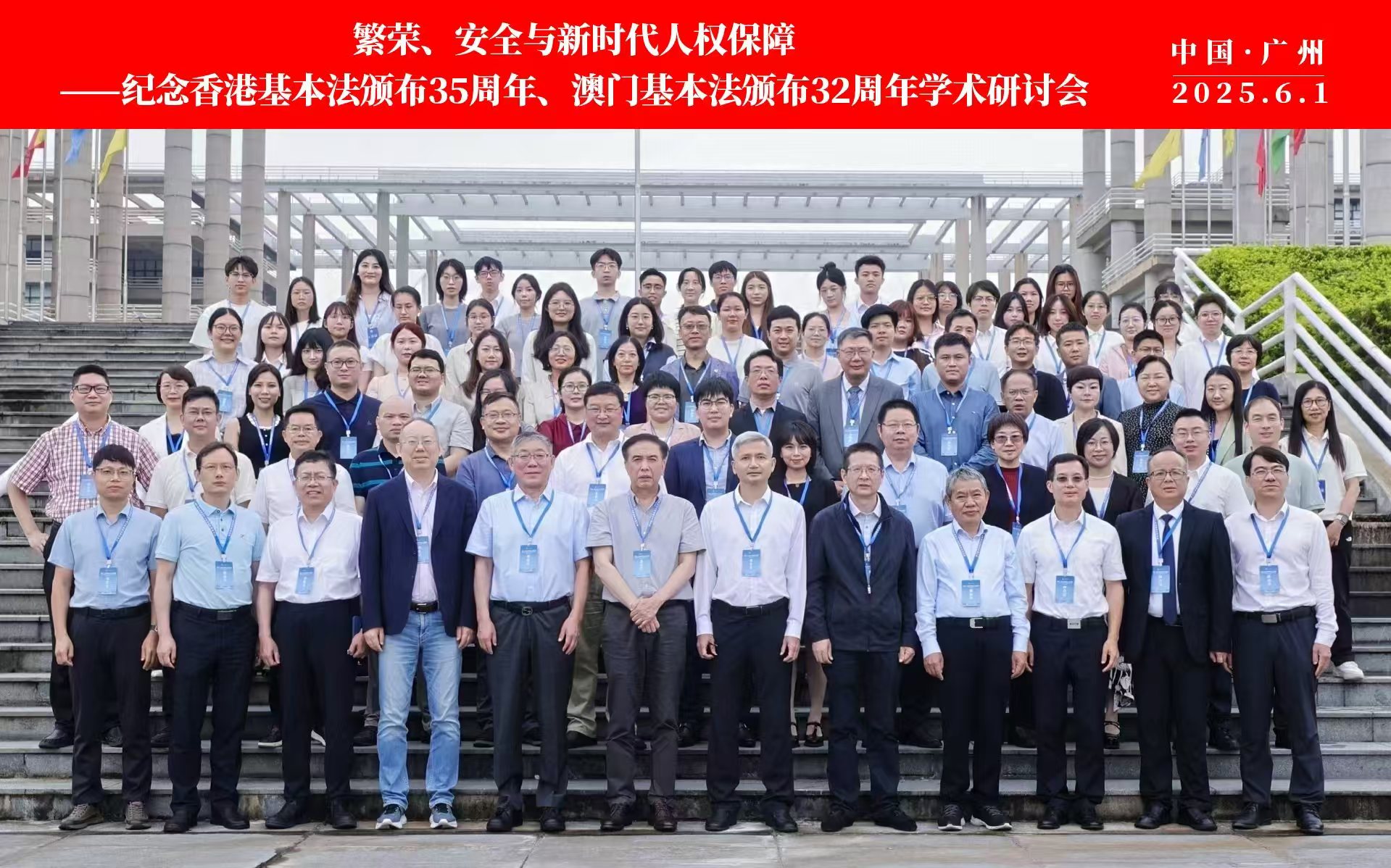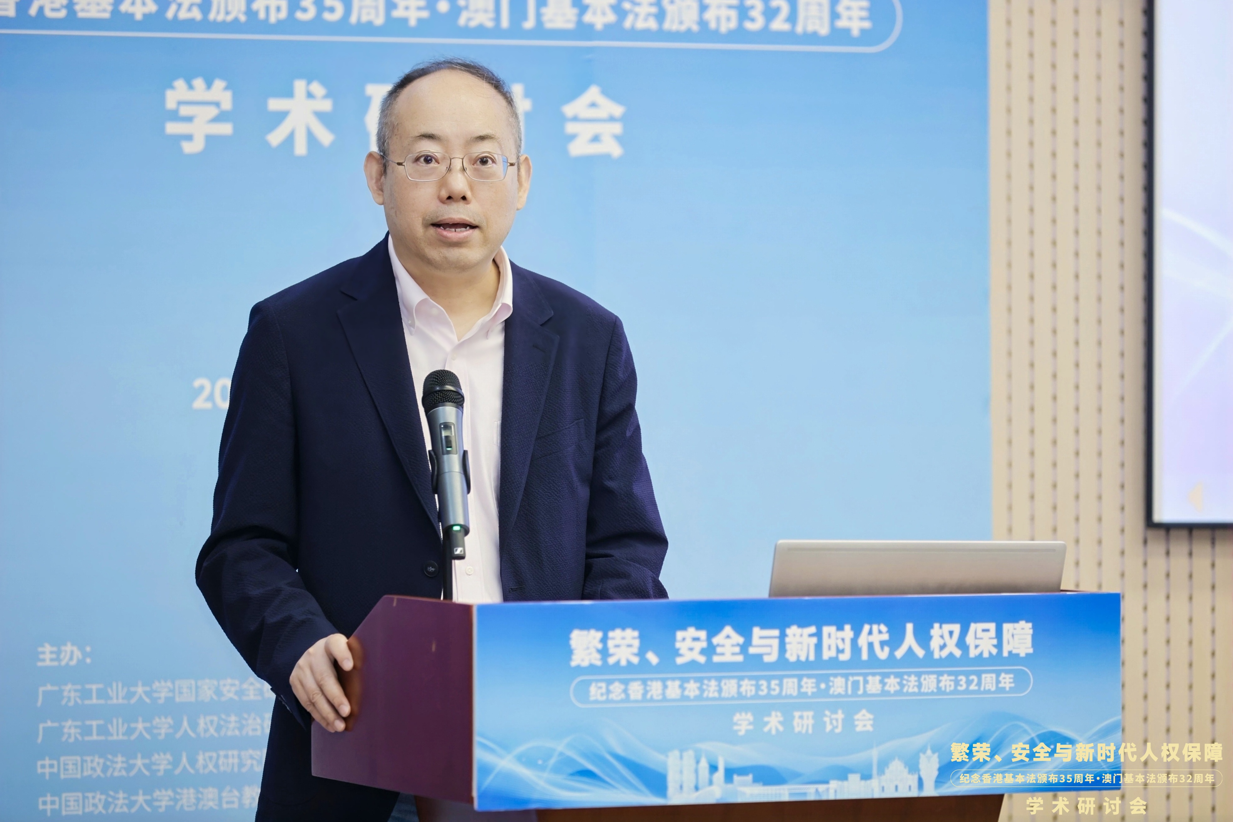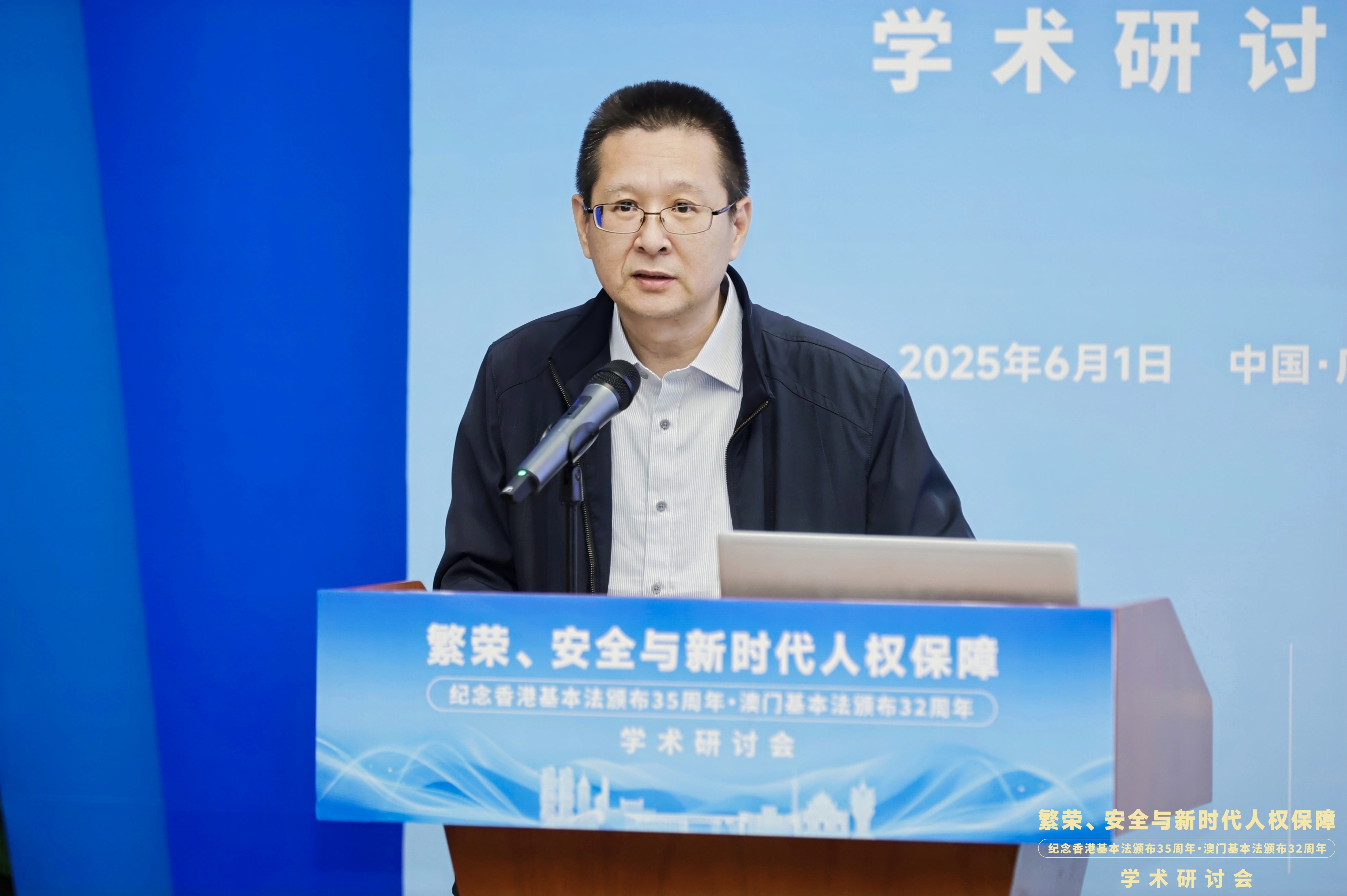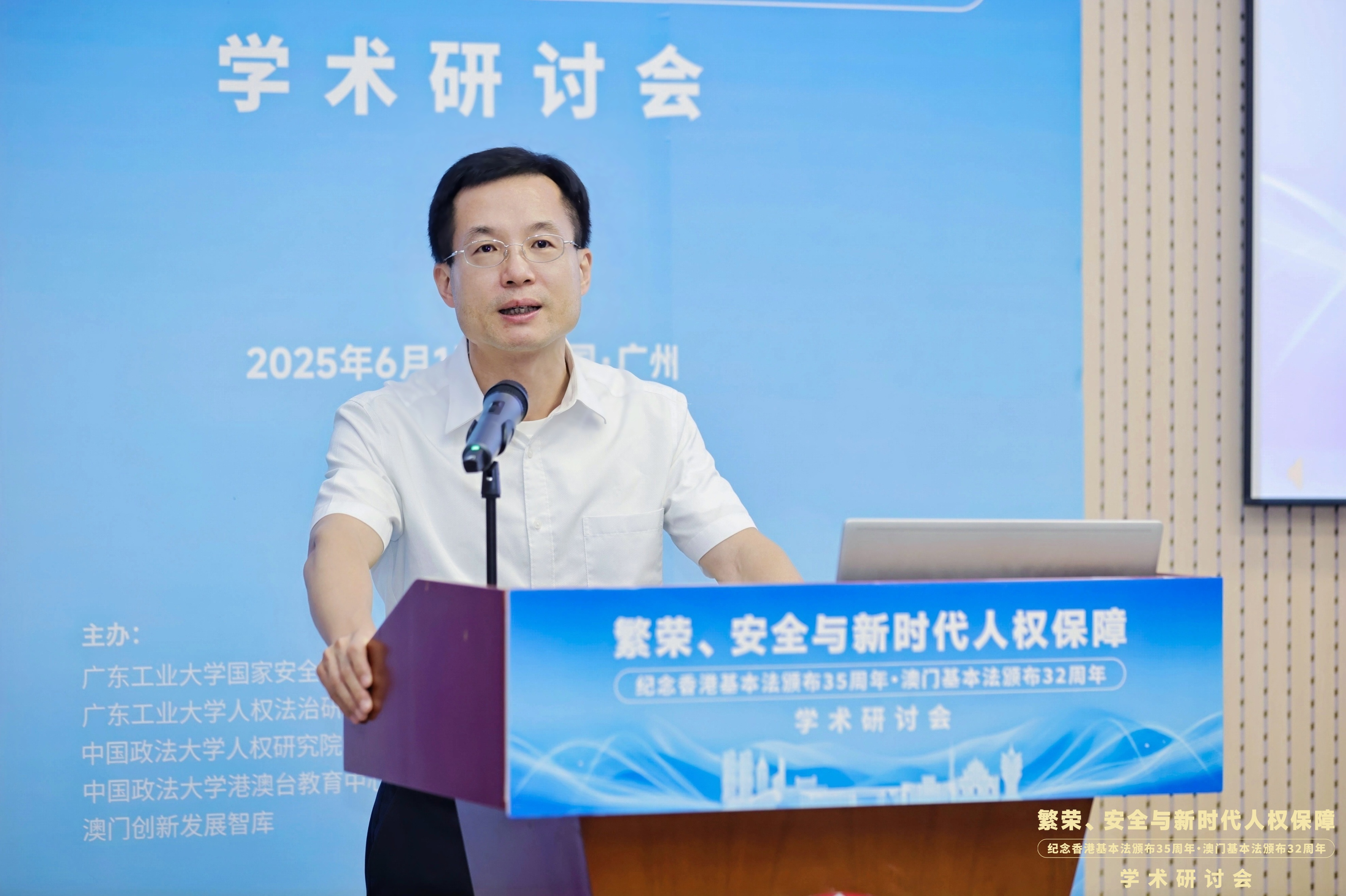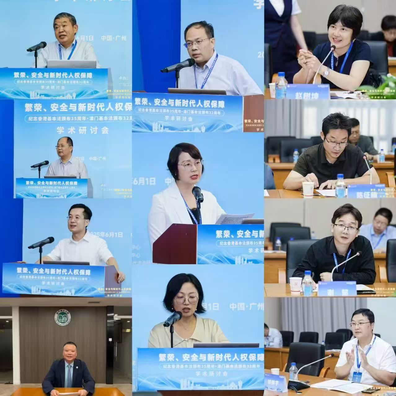 6月1日,“繁荣、安全与新时代人权保障——纪念香港基本法颁布35周年、澳门基本法颁布32周年学术研讨会”在广东广州隆重举行。此次研讨会由8xbet网国家安全研究中心、8xbet网人权法治研究中心、中国政法大学人权研究院(当代法治研究院)、中国政法大学港澳台教育中心以及澳门创新发展智库联合主办,由8xbet网法学院承办。来自国防大学、中国人民大学、中国社会科学院、吉林大学、中南大学、北京理工大学、中央民族大学、中南财经政法大学、华东政法大学、西南政法大学、云南大学、昆明理工大学、贵州财经大学、香港大学、香港城市大学、澳门大学、澳门城市大学、华南理工大学、暨南大学、深圳大学、广东外语外贸大学、广东财经大学、广州大学、肇庆学院、濠江法律学社、香港政策研究所等内地及港澳知名高校、研究机构的超过80位专家学者齐聚一堂,围绕国家安全法治、人权保障实践、粤港澳大湾区区域协同治理等核心议题展开深入研讨。