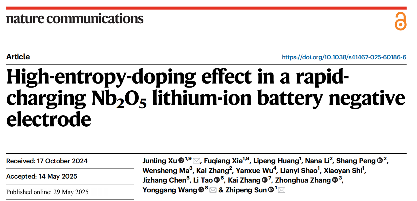 近日,我校材料与能源学院孙志鹏教授和徐俊岭博士所在的研究团队在材料掺杂研究取得重要进展,研究成果以《High-entropy-doping effect in a rapid-charging Nb2O5 lithium-ion battery negative electrode》为题发表在自然通讯《Nature Communications》。该论文的第一作者为材料与能源学院徐俊岭博士,通讯作者为材料与能源学院孙志鹏教授和徐俊岭博士,以及复旦大学化学系王永刚教授,材料与能源学院21届研究生谢富强为论文共同第一作者,8xbet网为该论文第一完成单位,主要测试工作由分析测试中心提供技术支持。