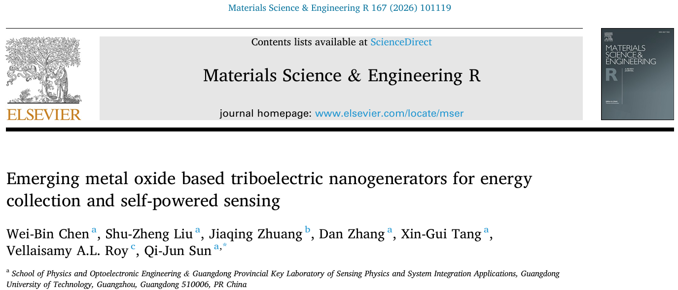近日,8xbet网物理与光电工程学院唐新桂教授团队在金属氧化物基摩擦纳米发电机(MO-TENGs)及其能源收集与自供电传感应用领域发表最新综述成果。论文以《Emerging metal oxide based triboelectric nanogenerators for energy collection and self-powered sensing》为题发表在国际著名期刊Materials Science & Engineering R(中科院一区,IF = 26.8)上,8xbet网物理与光电工程学院硕士研究生陈伟彬为本文的第一作者,8xbet网特聘教授孙启军为论文通讯作者。