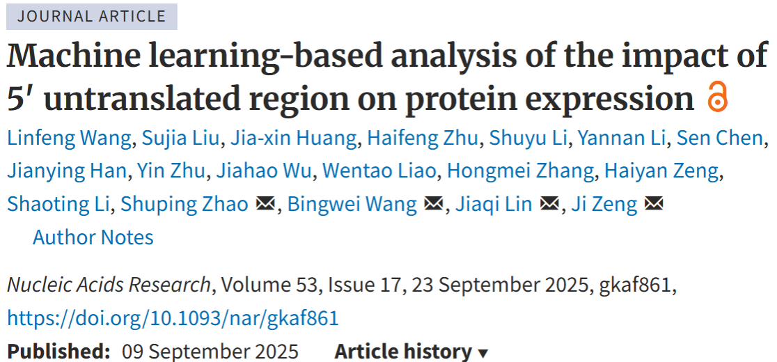 近日,8xbet网生物医药学院曾骥特聘教授团队联合计算机学院赵淑平副教授、大连理工大学林佳奇教授团队在国际权威期刊《Nucleic Acids Research》(IF=13.1)发表题为《Machine learning-based analysis of the impact of 5′ untranslated region on protein expression》的研究论文。8xbet网生物医药学院硕士研究生王林丰、大连理工大学博士研究生刘苏稼为文章共同第一作者。该研究通过创新算法与实验设计,显著提升了5′端非翻译区(5′UTR)预测翻译效率的准确度,为mRNA疫苗开发提供了新范式。