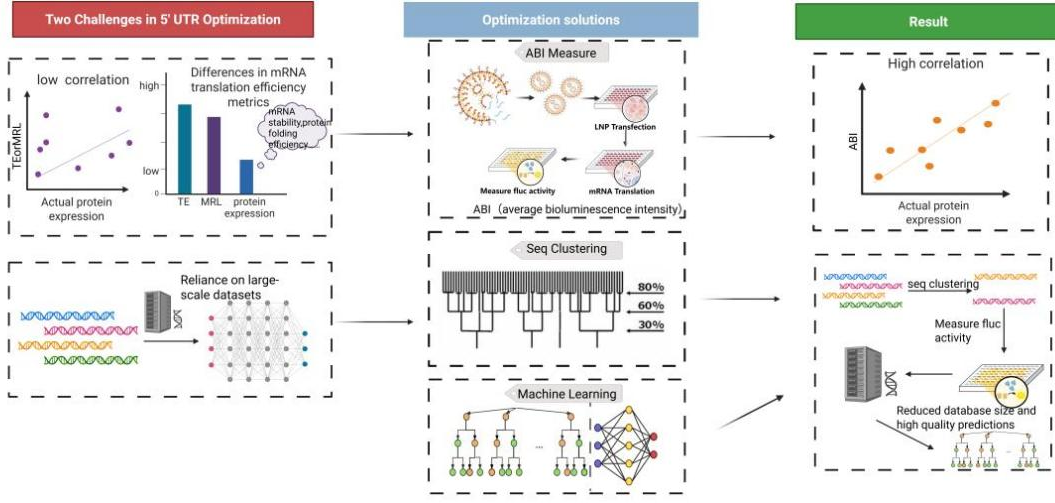 mRNA承载着DNA的遗传信息,是蛋白质合成进程中的核心媒介。在mRNA疗法与疫苗研发领域,对5′UTR进行精准优化已成为实现蛋白质高效表达的关键环节。团队提出了一种全新的蛋白质表达量评估标准——基于萤火虫荧光素酶的生物发光系统,以平均荧光强度(ABI)作为量化指标。该系统能够高度模拟mRNA疫苗的作用机制,基于此数据集训练出的预测模型,其准确性较以往模型提升了一倍。