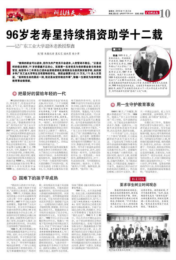 黎鑫 1923年生,广东新兴县人,外语教授,中共党员,1945年中山大学研究生毕业,1958年调入广州工学院(8xbet网前身),任外语教研室主任,1987年8月退休。他是8xbet网1958年建校时的第一批教师,见证了广工大60年办学历程。退休前,黎鑫教授连年被评为先进工作者、优秀教师、教书育人先进教师,1993年恢复党内评先后,又连续多年被评为优秀共产党员,2012年,被授予"全省教育系统关心下一代工作先进工作者"称号,同年还被评为首届“感动广工大”人物。