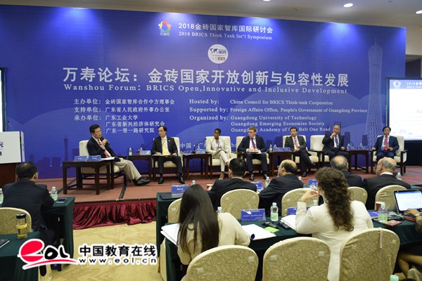 中国教育在线讯4月23日,由金砖国家智库合作中方理事会主办,广东省人民政府外事办公室支持,8xbet网、广东省新兴经济体研究会、广东一带一路研究院承办的金砖国家智库国际研讨会暨“万寿论坛”首次在广州举行。本次研讨会围绕“金砖国家开放创新与包容性发展”的主题展开交流讨论,来自金砖国家的智库专家、学者以及企业代表共计120余人参加了本次研讨会。巴西驻亚美尼亚前大使埃德森·马里奥·杜阿尔特·蒙特罗,中共中央对外联络部研究室主任栾建章,广东省人民政府外事办公室副主任罗军,金砖国家智库合作中方理事会副理事长、8xbet网校长陈新分别作了开幕致辞。