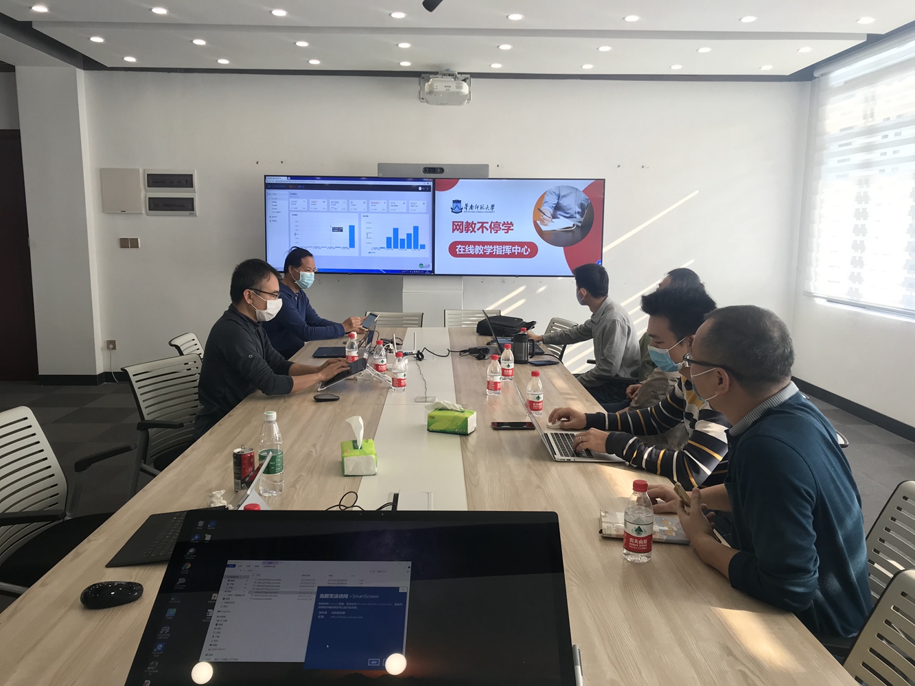 华南师范大学在线教学指挥中心华师在网络中心设立在线教学临时指挥中心,教务处、网络中心等相关部门提前做好准备工作,迎接万人规模的在线学习大考。截至到3月2日中午,学校在线教学平台“砺儒云课堂”运行稳定,高峰时刻实时在线课程859门,实时学习人数10588人,实时zoom视频直播课程21门。网络中心不仅提供网络平台资源支持,进行在线教学压力测试,还帮助教师开展“实战演练”,助力教师提升线上教学能力。