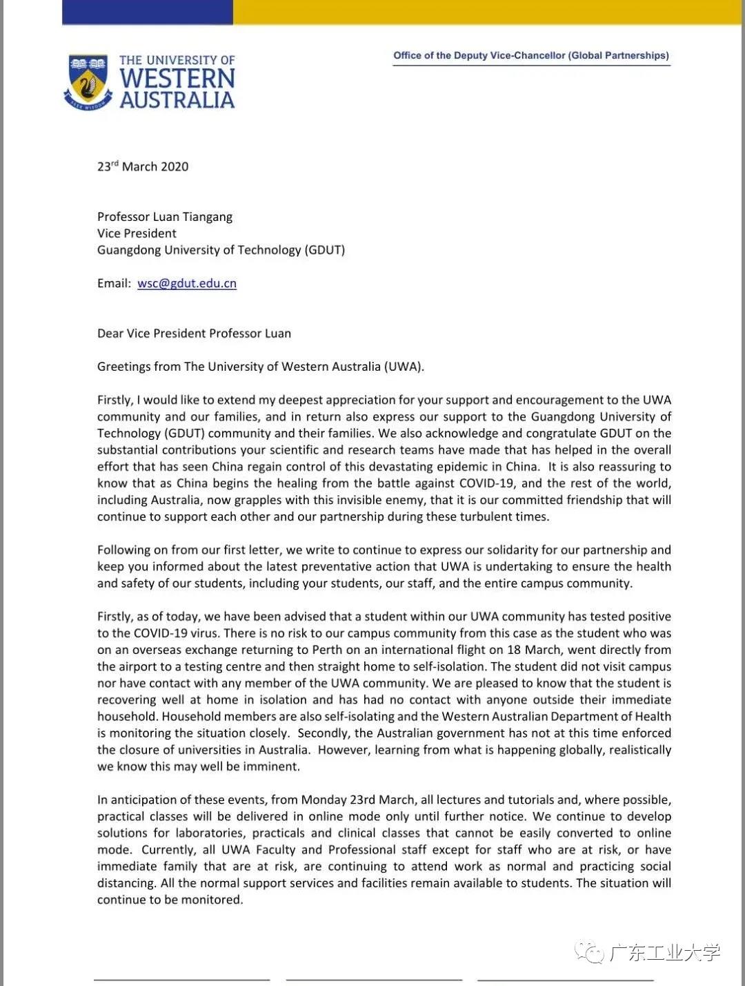 西澳大学副校长Tayyeb Shah来信同气连枝,共盼春来。疫情之下,广工做好海外师生疫情防控工作,落实海外师生的动态管理,努力维护海外师生的身心健康。(更多新闻资讯,请关注羊城派 pai.ycwb.com)