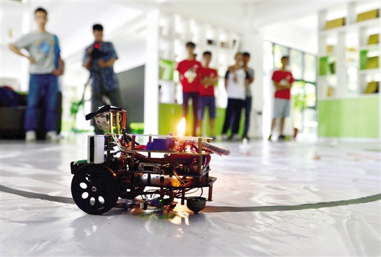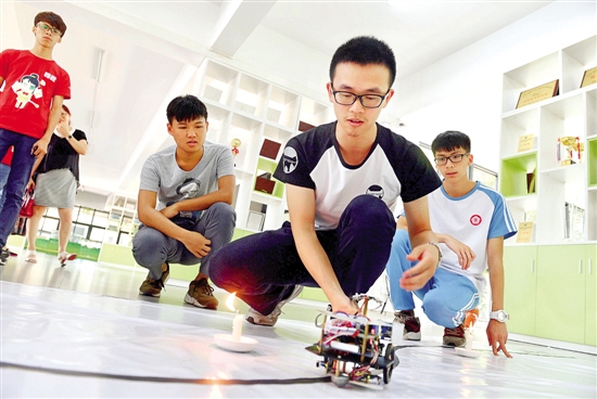 昨天下午,在8xbet网的创客中心,多名参赛选手正在紧张地调试他们的“循迹灭火机器人”。