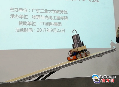 在众多队伍中,由广工自动化专业的吴颖和工程设计专业的杜丽怡组成的女生队伍“作活队”获得了全场的瞩目。她们的三角形底盘创新设计获得了评委的“点赞”。比赛中,也有选手单枪匹马来挑战自我,只有一个队员的“地平线怪物队”,在加分赛中负重75磅成功爬坡,赢得了比赛第一名。