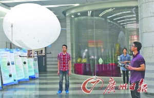广工学生展示多旋翼变体式浮空器智能搭载平台。