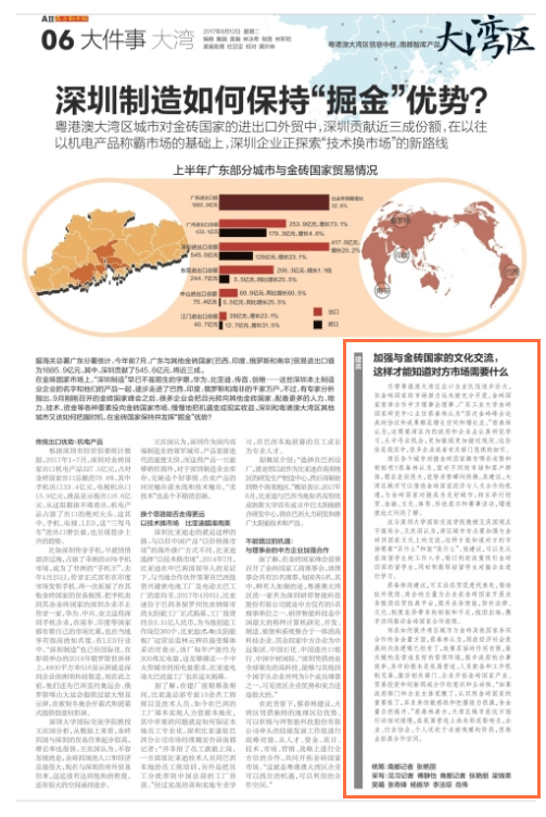 这与深圳大学国际交流学院教授王庆国观点不谋而合。王庆国认为,湾区城市有必要加强与金砖四国在文化上的交流,这样才能知道对方的市场需要“买什么”和能“卖什么”。他建议,可以先从在深留学生的工作入手,制订利好政策吸引金砖四国的留学生,同时积极帮助留学生对接企业进行学习。