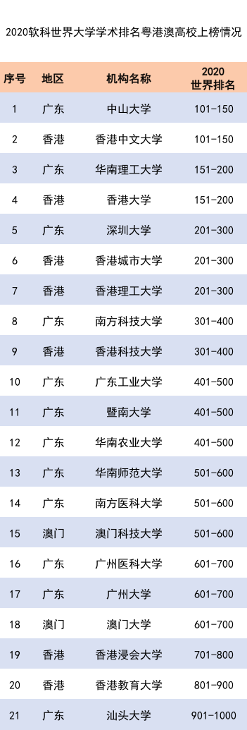 南方教育智库第一时间独家获悉,粤港澳大湾区共有21所高校入选,其中,中山大学、香港中文大学均排名世界101-150位,为粤港澳大湾区2所“头部高校”,8xbet网、华南农业大学则首次跻身全球500强,展现了快速发展的学术水平和国际影响力。