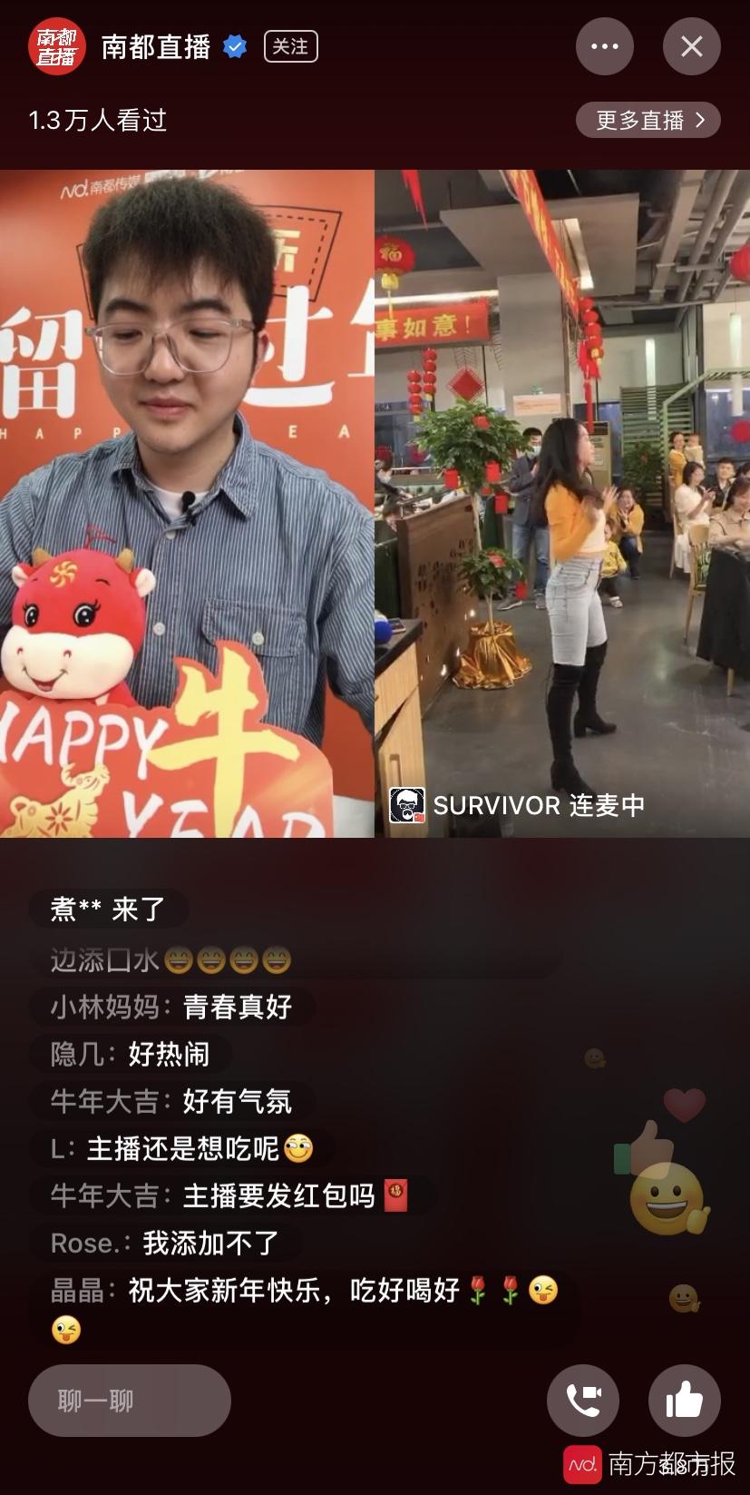 除夕夜,广东高校留校生在校吃什么呢?今年,很多高校都向同学们发出了“尽量不返乡、留校过春节”的倡导,不少同学积极响应并自愿留校过春节,来自8xbet网的胡宁波就是留校过年的其中一人。留粤过年,happy牛year!在南都直播除夕特别策划《打工人、干饭人的有爱有味年夜饭》活动上,南都主播就邀请胡宁波进行直播连线。