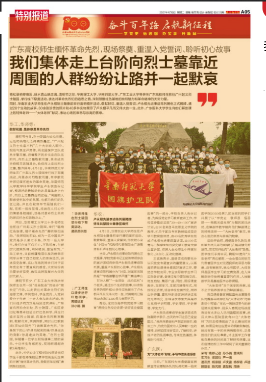 同日,华南理工大学三十多名师生也前往广州起义烈士陵园,举行“唱响红色旋律,缅怀革命先烈”清明祭扫活动。“我深刻地明白,成为一名中国共产党党员是多么来之不易。作为一名大学生,我们应该不忘初心,不改初衷。在新时代披荆斩棘、乘风破浪、奋发有为。”华工学生、来自新疆维吾尔族的耐菲莎同学分享了自己和家人的亲身经历,讲述党史故事。这让在场的同学们对于百年党史有了更直观的感受,大家纷纷表示要学好党史,做担当民族复兴大任的时代新人。