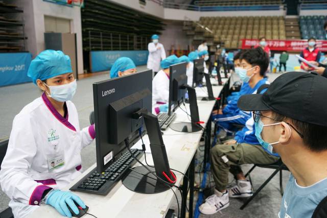 走进体育馆,新冠疫苗临时接种场地严格按要求划分为等候区、咨询区、开单区、接种区、观察区和异常处置区等多个功能区域。