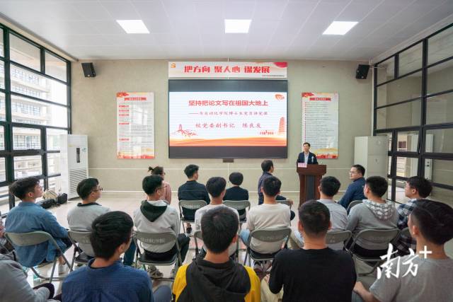 广工党委副书记陈良友以《坚持把论文写在祖国大地上》为题为自动化学院博士研究生党员讲授党课,勉励学生,牢记科技强国使命,树立科研报国抱负。