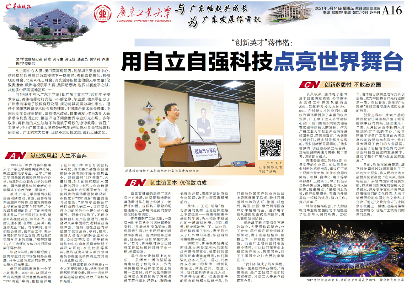 目前,浩洋在城市景观、演艺科技等领域为国家提供了广泛的文艺服务,将人民的艺术生活提升到新高度。“在未来,浩洋将结合广东省与国家的发展策略,持续在创新研发层面投入更多成本,开发更多文化科技产品以增强我们的文化自信,力求打造世界级的中国灯光文化科技企业。”通过“文化走出去”,让国家形象更上一层楼,这是蒋伟楷的勃勃雄心,也是广工校友们的共同企盼。