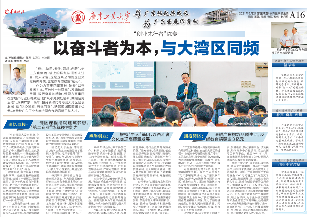 值得一提的是,陈专难忘母校恩情,多年来方直集团一直与广工紧密合作,共同寻求多层次、多角度的人才培养机制。据悉,方直集团向广工捐助资金1000万元设立了“方直奖学金”,用以奖励国际、国内权威大赛的获奖学生,鼓励有创业梦想的优秀青年。集团还设立了广工校外实习基地,开设实践教学课程,助力广工培养适应社会需求的有创新能力的高素质人才。此外,陈专被聘为广工客座教授、硕士生导师,为学生讲授工程管理和企业经营方面的课程,他还捐资100万元升级改造学校田径场。“未来,方直还将与广工一起,在科技成果转化、文化振兴、建筑艺术等领域深度合作,为社会输送更多人才。”陈专说。