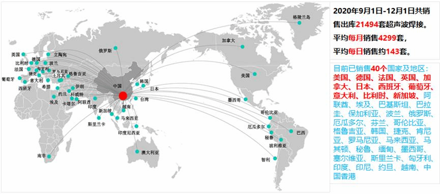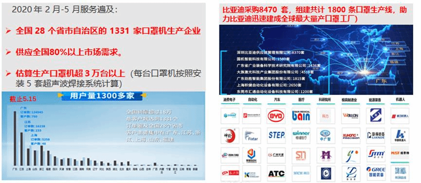 该项目成果在疫情高峰期间支撑广东生产了全国80%口罩机。研发的智能搜频跟频超声波焊接系统,实现了19万套超声波焊接系统的生产销售,服务全国28个省市自治区1000多家口罩机生产商,并出口49个国家及地区,直接支撑比亚迪生产1800台口罩机并成为世界最大口罩生产商。研发的口罩机效率提升30%以上,成品合格率达 99.2%,出口30多个国家;设计的贴条机质量稳定,销售达1000多台。项目产品超声波焊接机、口罩机目前仍在向全球各地销售。