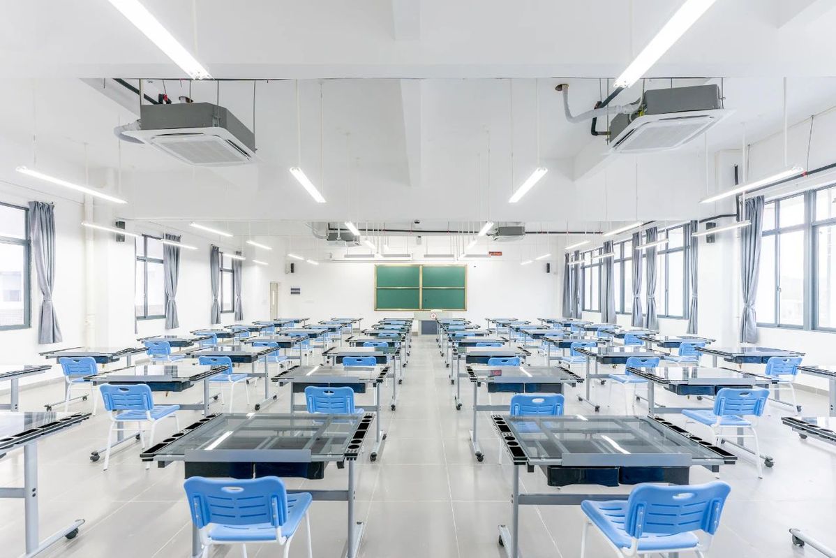 揭阳校区目前建成投入使用的有两栋教学楼,共有53间智慧课堂和多媒体课室,未来可容纳4个年级共5000人的上课需求。校区还建成了艺术工坊、影视实验室等艺术教室。