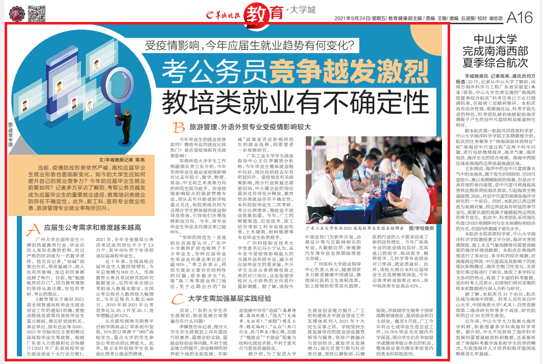 华南师范大学学生工作部副部长李卫东介绍,今年华师毕业生就业受疫情影响对比去年较少,数学、物理、英语、中文和艺术类等方向的师范生较为抢手。而受疫情影响较大的旅游管理专业,则从去年开始受到学校重点关注,校院两级共同为这部分学生群体提供就业指导及咨询,引导他们合理选择职业方向。今年,该专业毕业生毕业去向落实率已超90%。